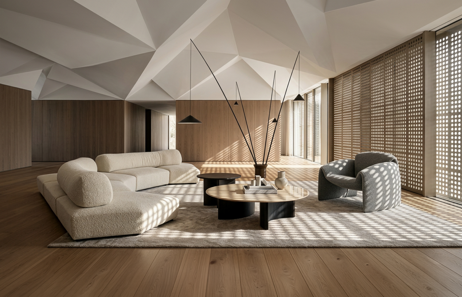 Sculptural modern living space with geometric ceiling and dramatic light patterns.