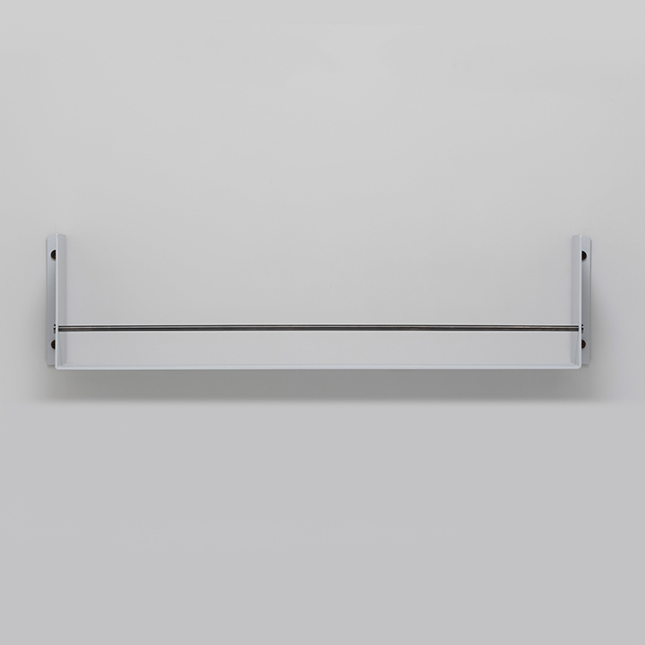 A shelf made from solid, powder coated metal with precisely engineered solid metal detailing.