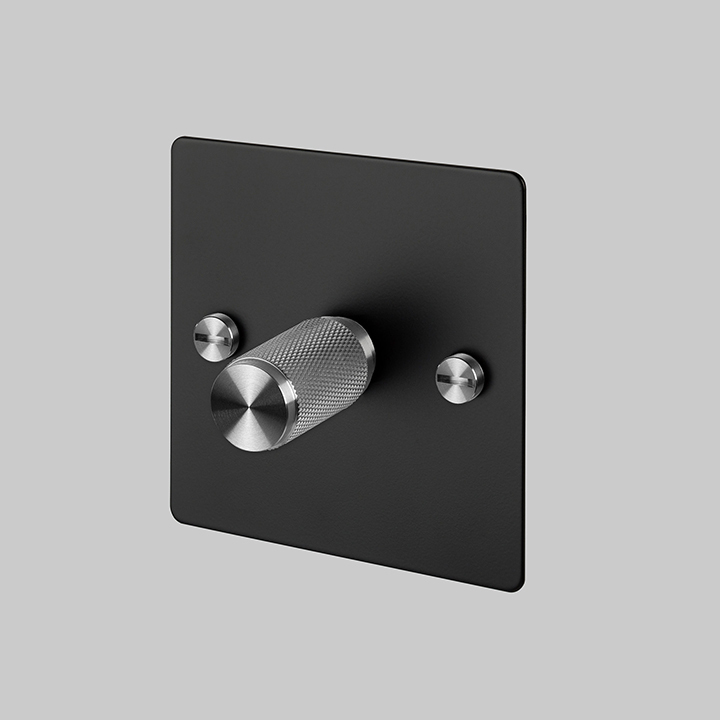 The dimmer knob features our signature, diamond-cut, cross knurl pattern and the flat plate is fixed with our signature, solid metal, coin screws