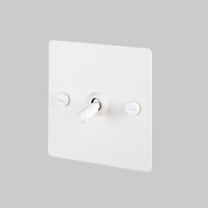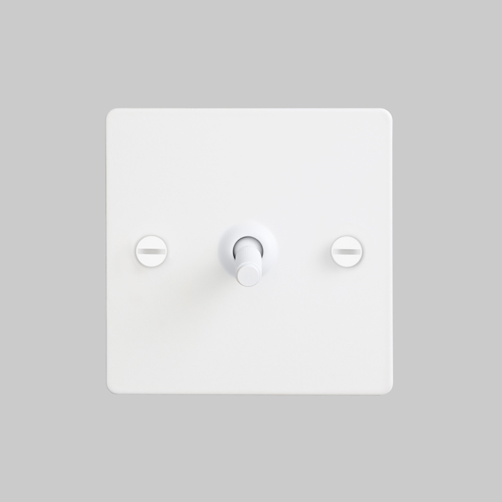 A single euro plug socket made from solid metal and our signature solid metal penny buttons in a WHITE finish