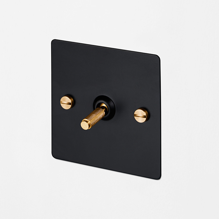 The intermediate toggle switch features a flat plate, fixed with our signature solid metal coin screws