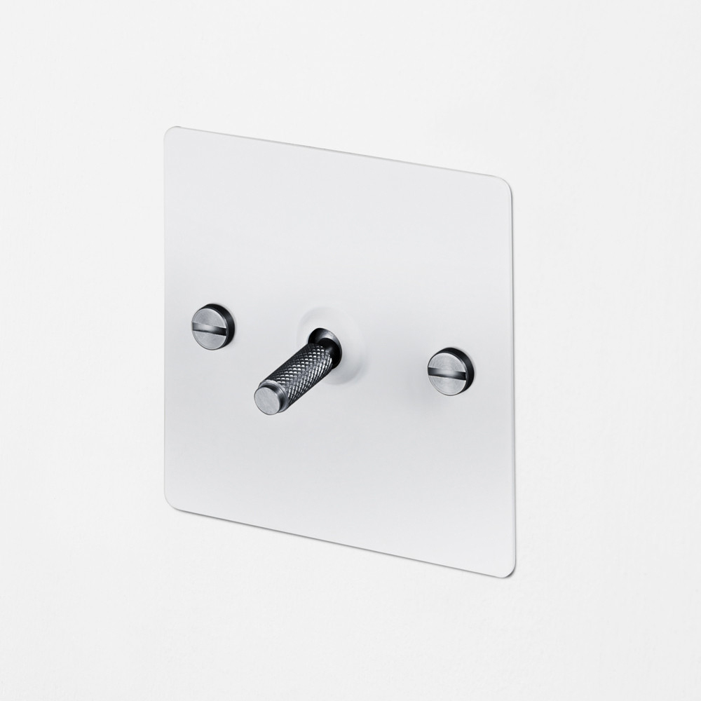 The intermediate toggle switch features a flat plate, fixed with our signature solid metal coin screws.