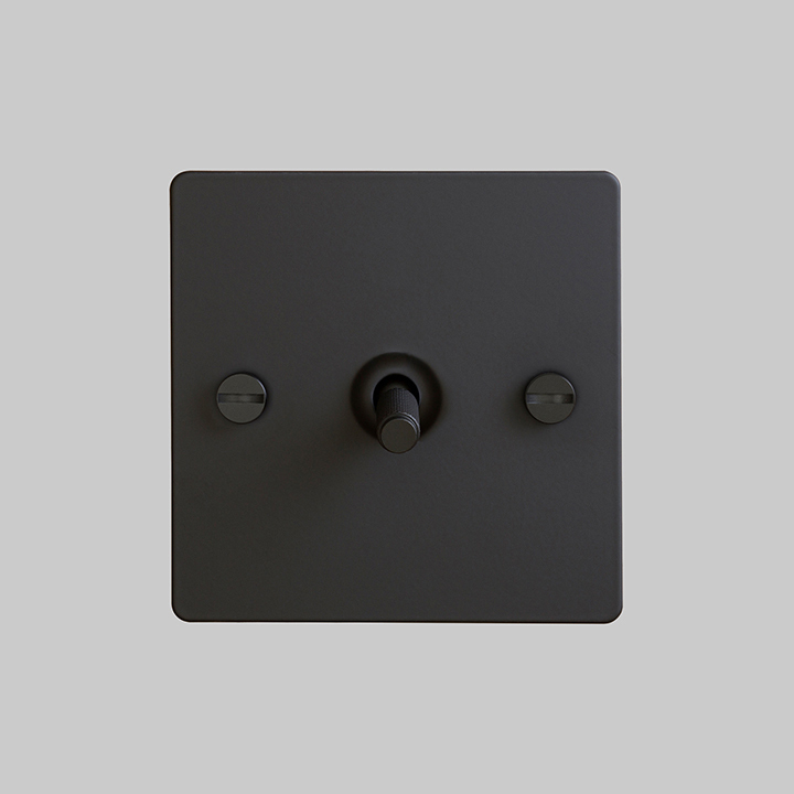 The toggle switch features a flat plate, fixed with our signature solid metal coin screws