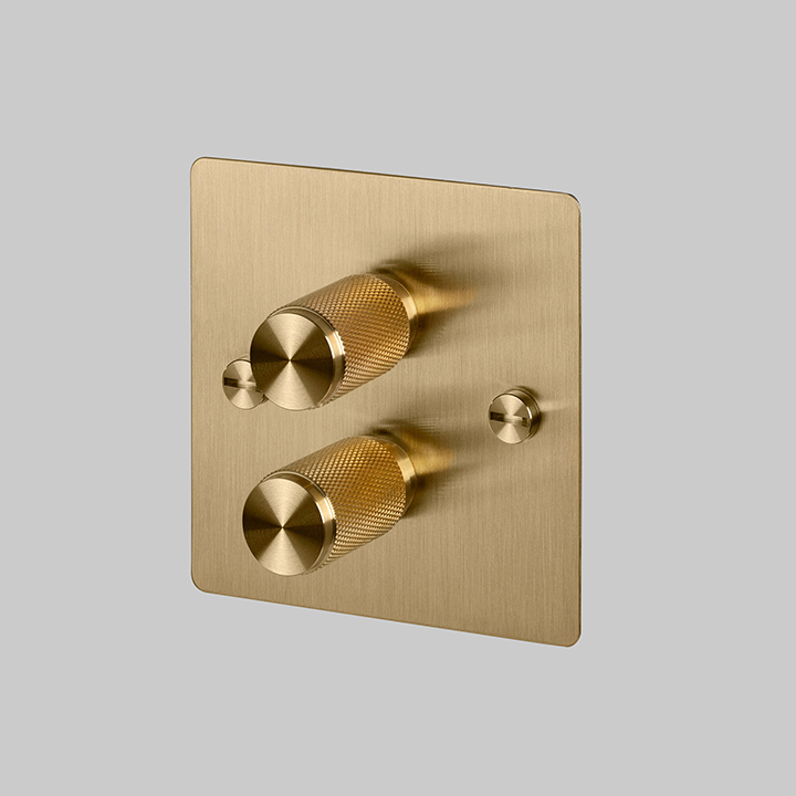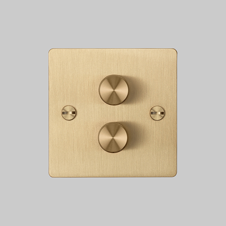 The dimmer switch features a flat plate made from lightly brushed brass. The plate is fixed with our signature, solid brass, coin screws