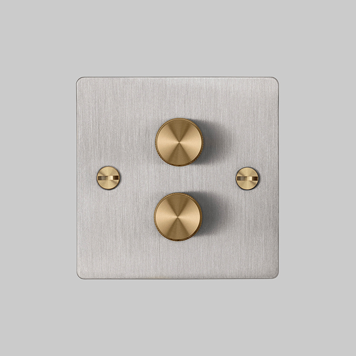 A 2G dimmer switch in solid metal finished in durable, UV stabilised, PU paint. It comes with a choice of solid metal detail kits including a dimmer knob and coin screws, available in steel, brass or black.