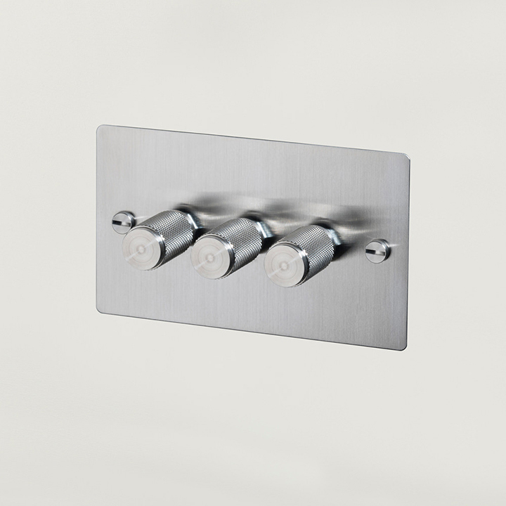 A 3G dimmer switch finished in steel. The dimmer knob features our signature, diamond-cut, cross-knurl pattern and is made from solid brass.