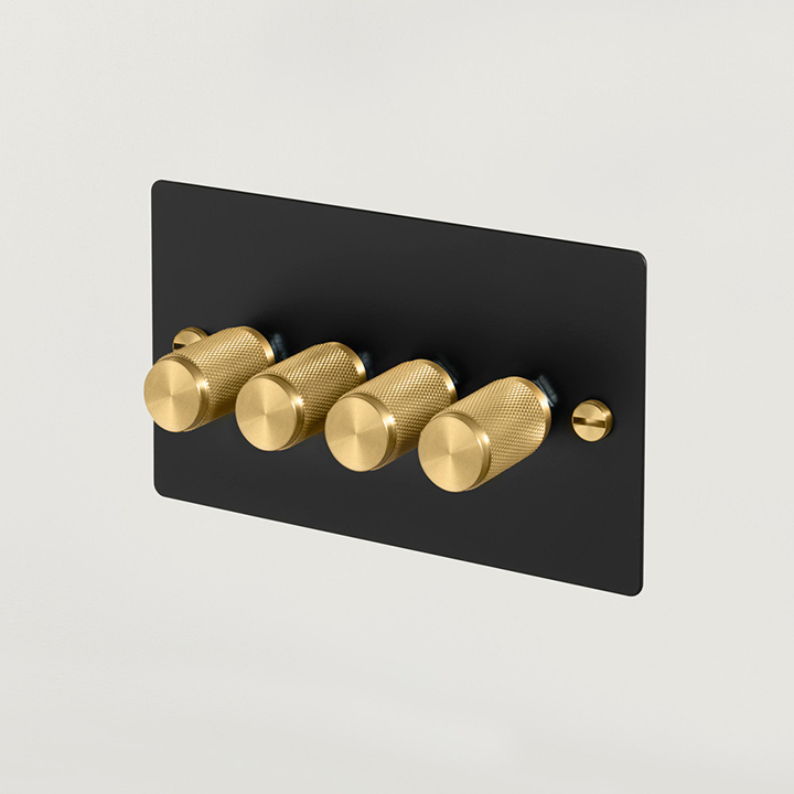 The dimmer knob features our signature, diamond-cut, cross knurl pattern and the flat plate is fixed with our signature, solid metal, coin screws.