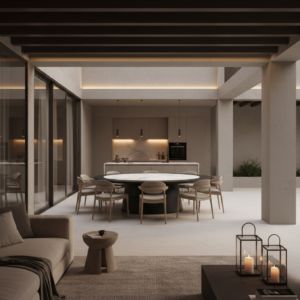 Elfo Dining Table – 1.5 is designed around a strong pedestal silhouette, clean, grounded, and visually quiet, allowing the form to sit naturally in modern dining rooms, open-plan kitchens, and hospitality settings.
