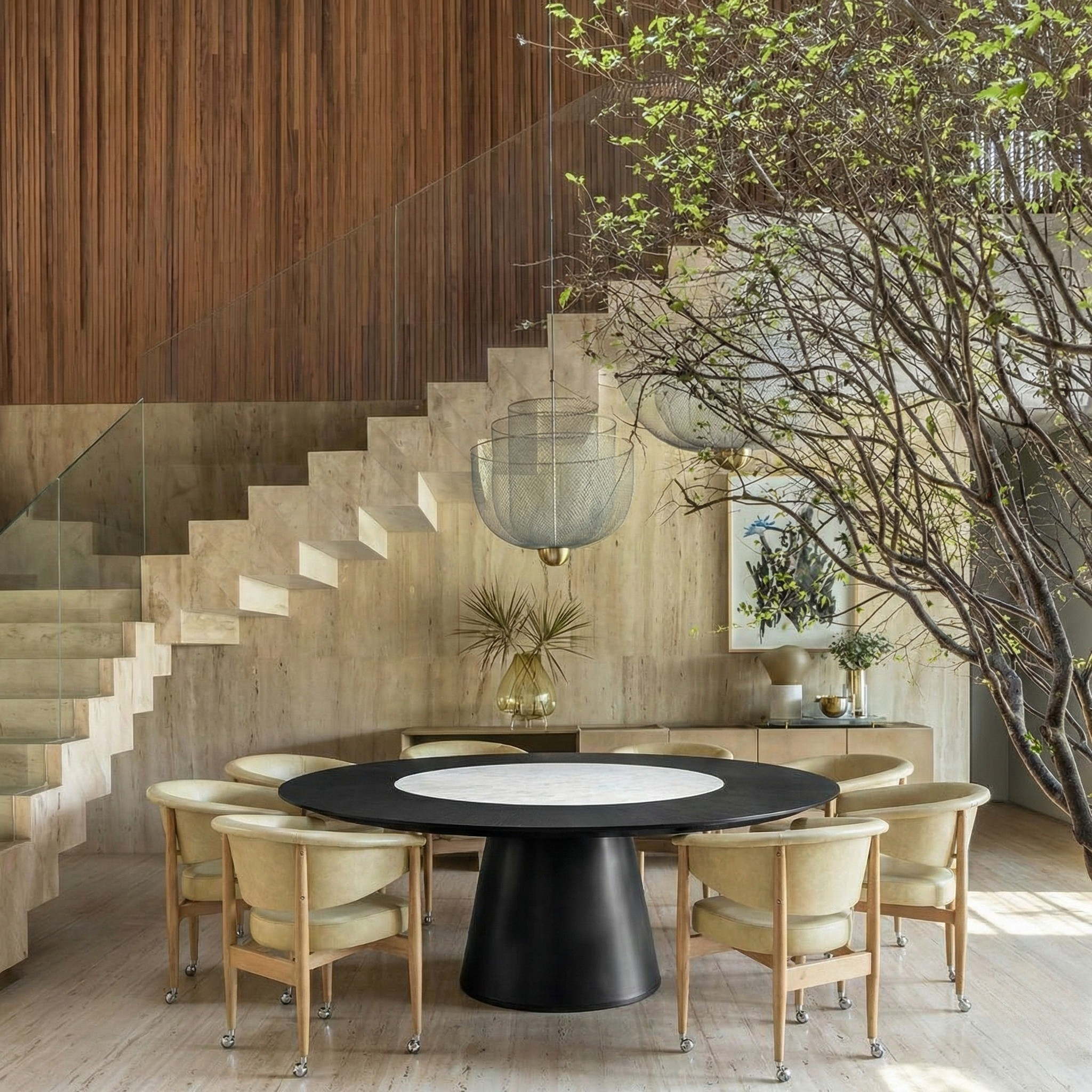 A sculptural round dining table that combines warm oak veneer with a refined marble centre for a calm, architectural focal point.
