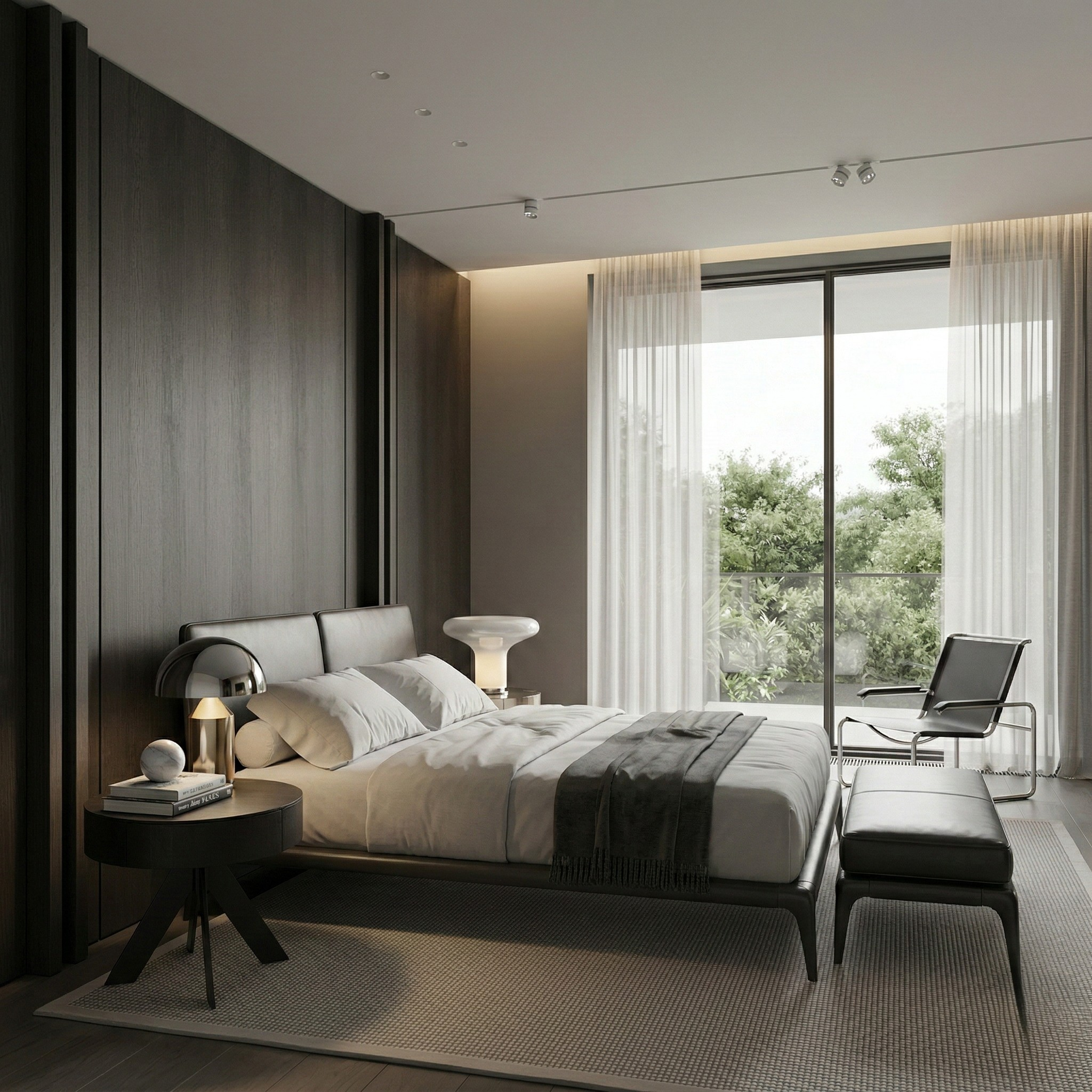 A round bedside table with a grounded profile and crisp, architectural legs, designed to bring order and warmth to contemporary bedrooms.