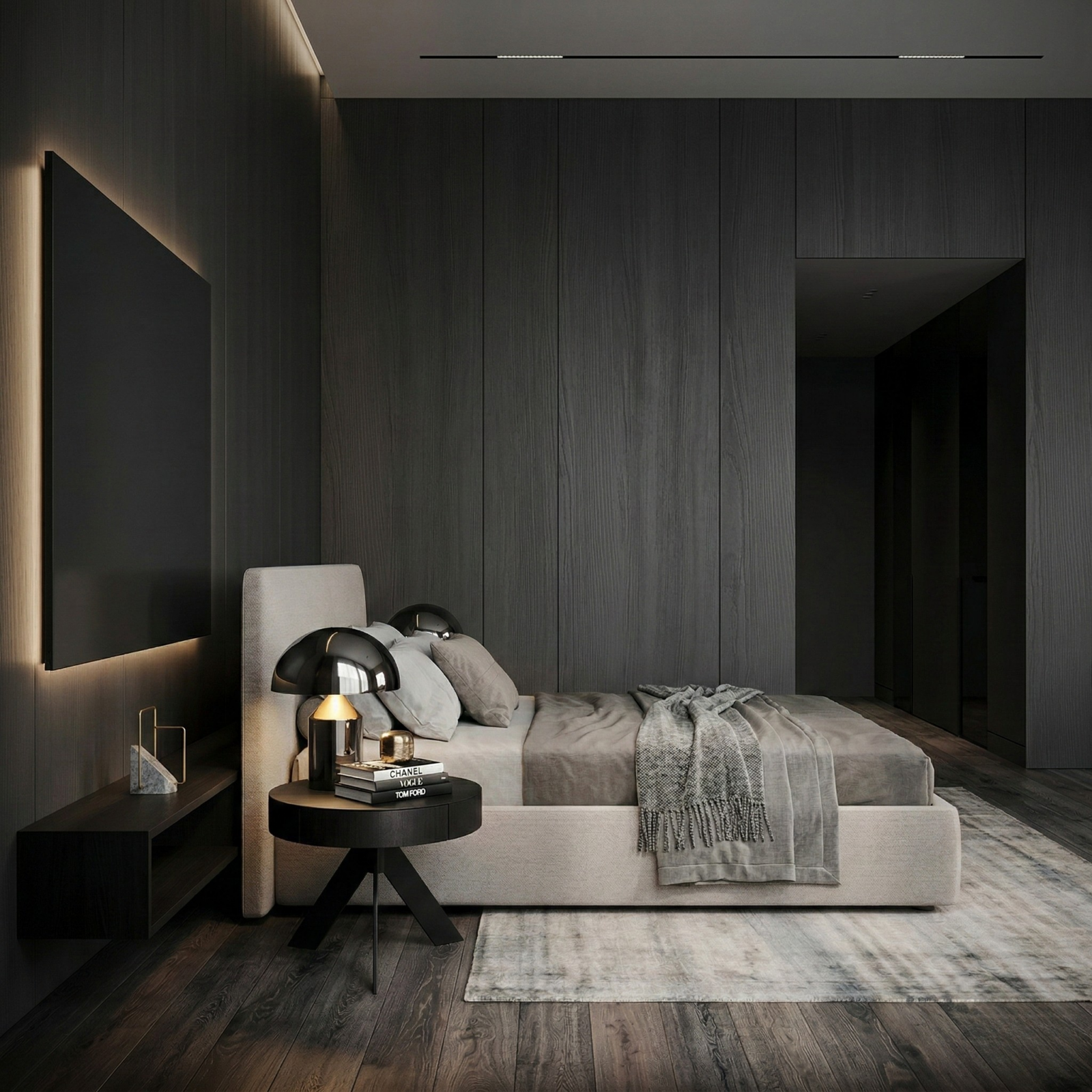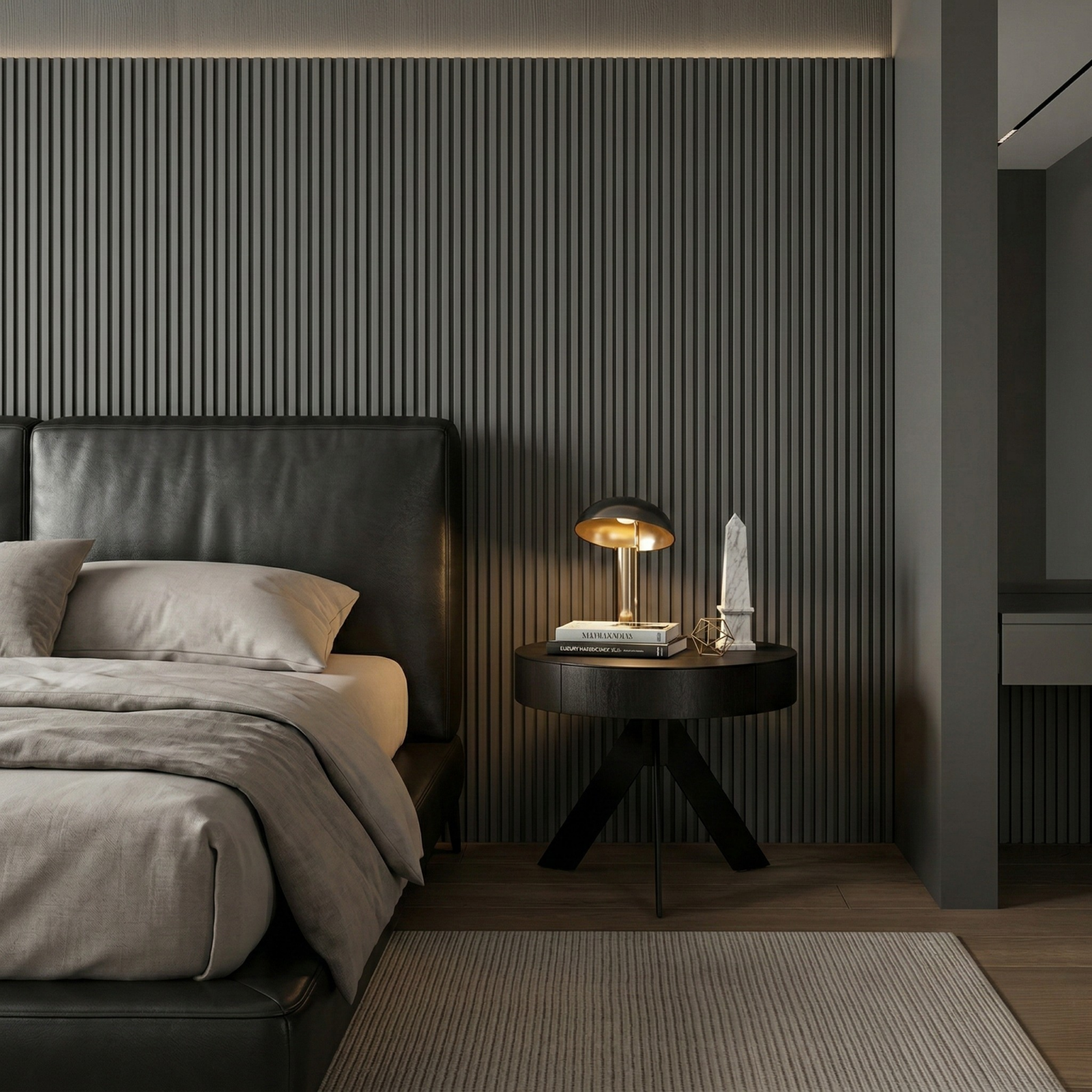 A round bedside table with a grounded profile and crisp, architectural legs, designed to bring order and warmth to contemporary bedrooms.
