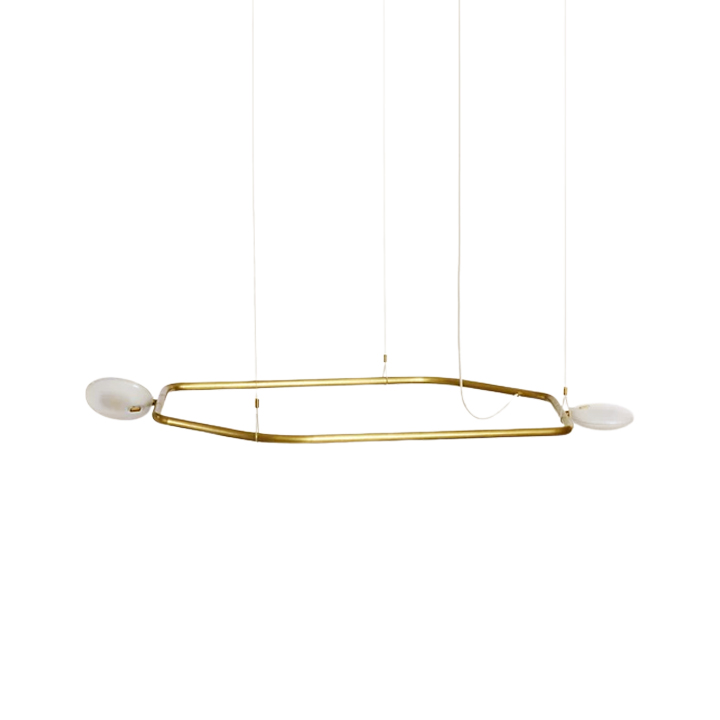 Lampu gantung horizontal dengan dua titik cahaya untuk pencahayaan merata dan seimbang. Kombinasi aluminum dan glass berwarna gold menghadirkan aksen elegan pada ruang modern.
