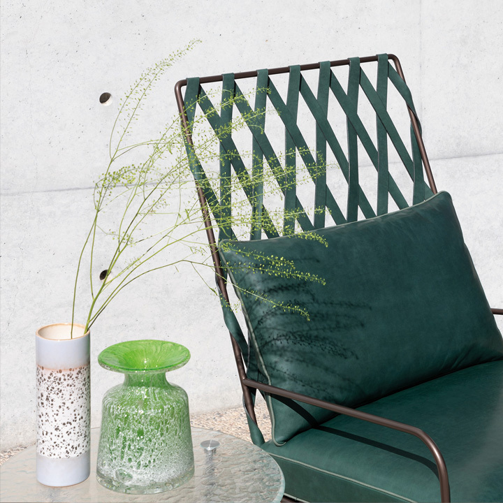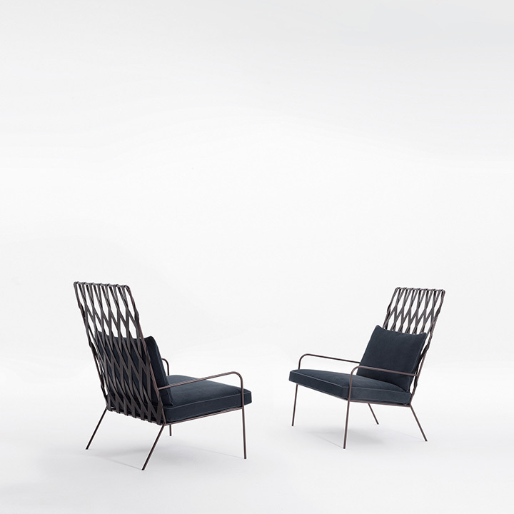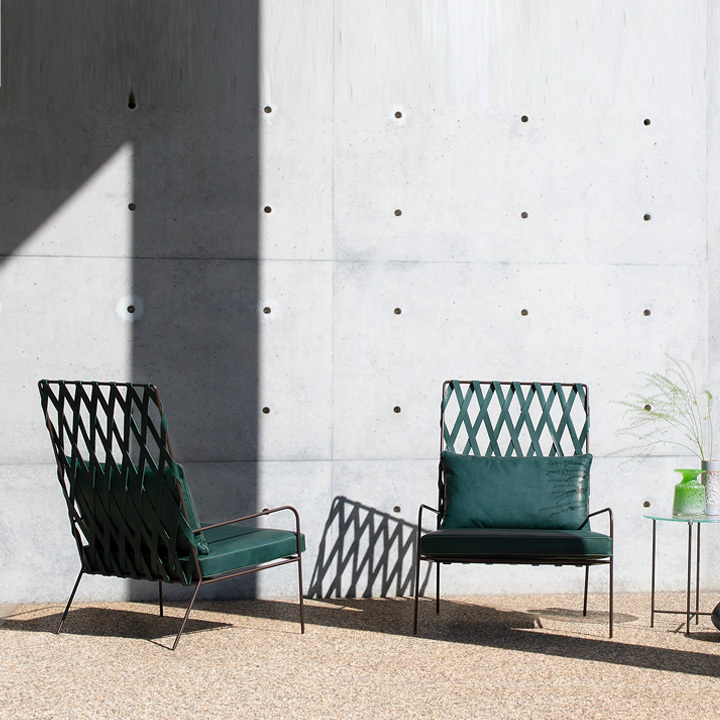 Modern and sophisticated, minimalist and stunning, the Alix armchair stands out for its woven backrest obtained by intertwining leather strips