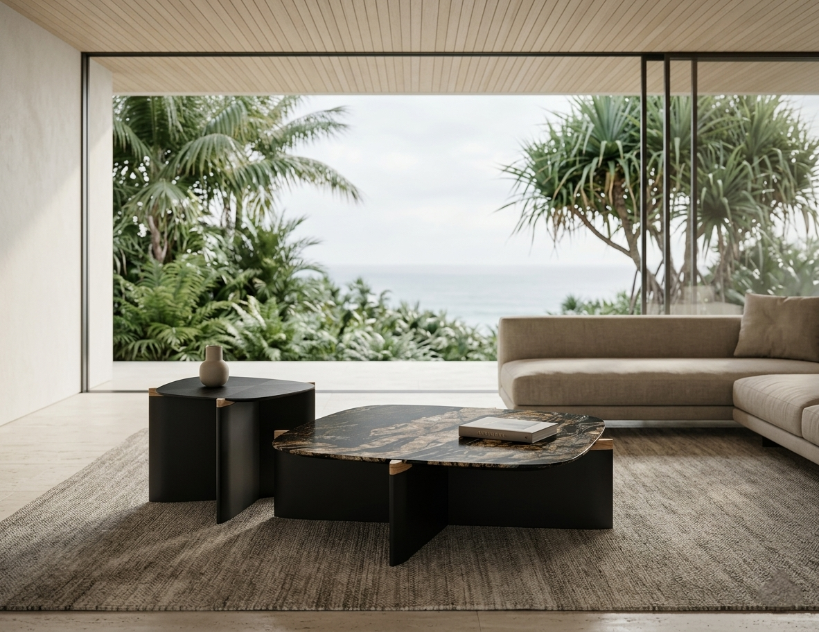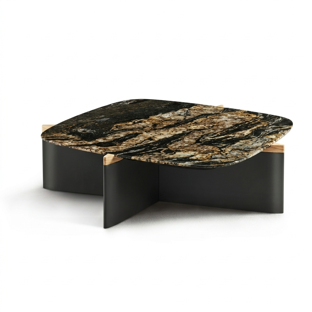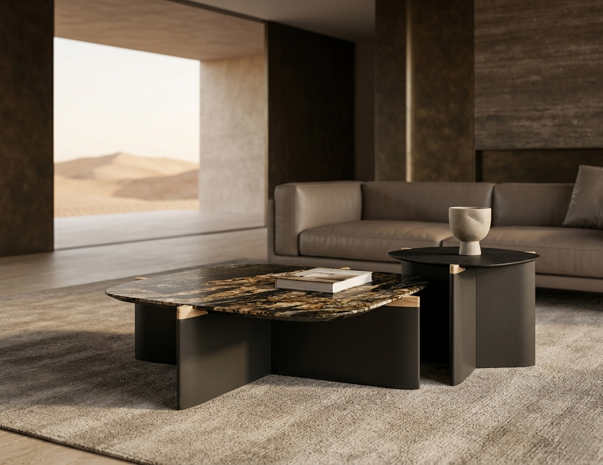 Alvaro is conceived as a modular coffee table system where geometry, material, and balance come together in a refined sculptural form. Each table features a soft organic square top resting on intersecting curved panels, forming a strong architectural base that feels both grounded and elegant.