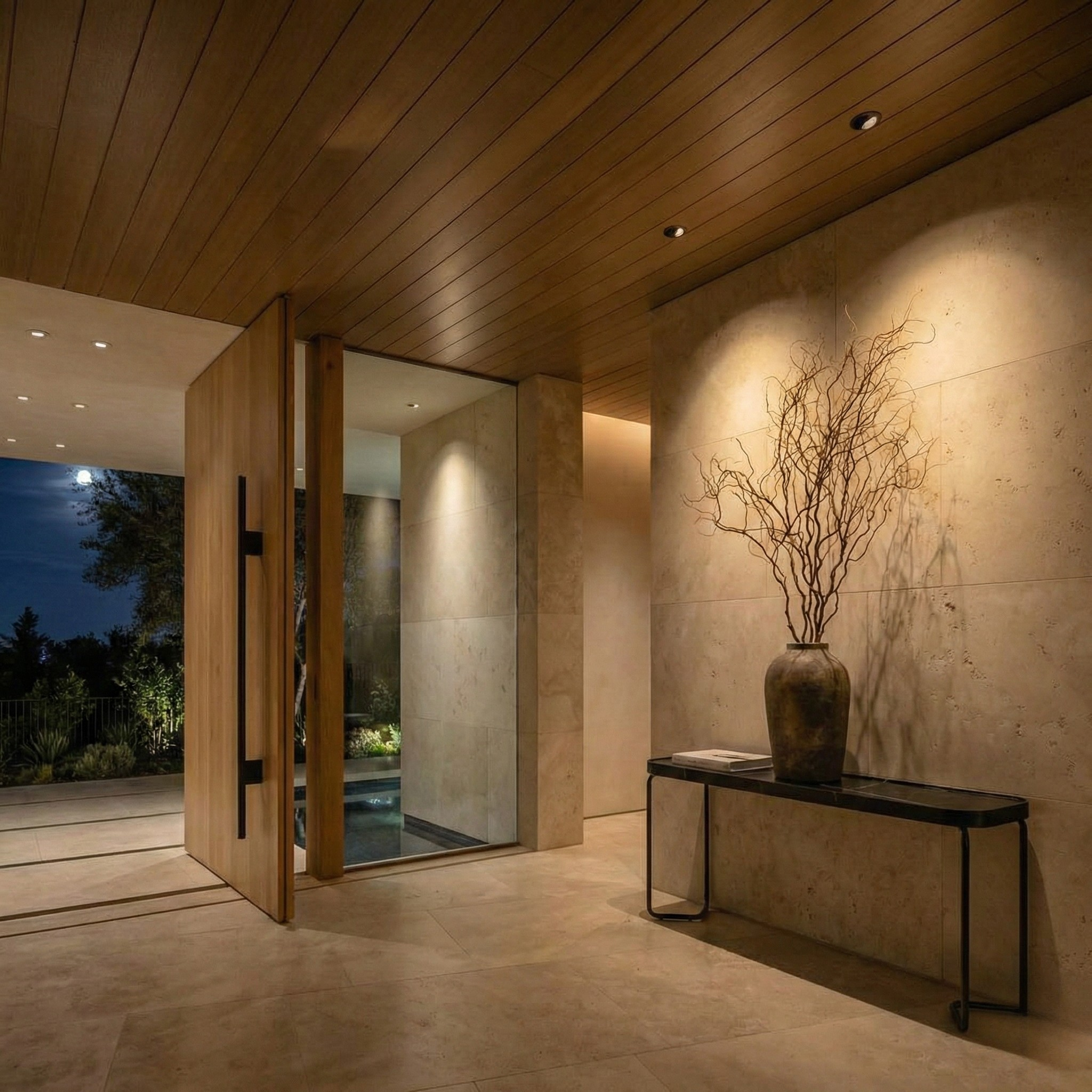 Use Antica as a hallway console, behind-sofa table, or a focused display surface in residential and hospitality settings.