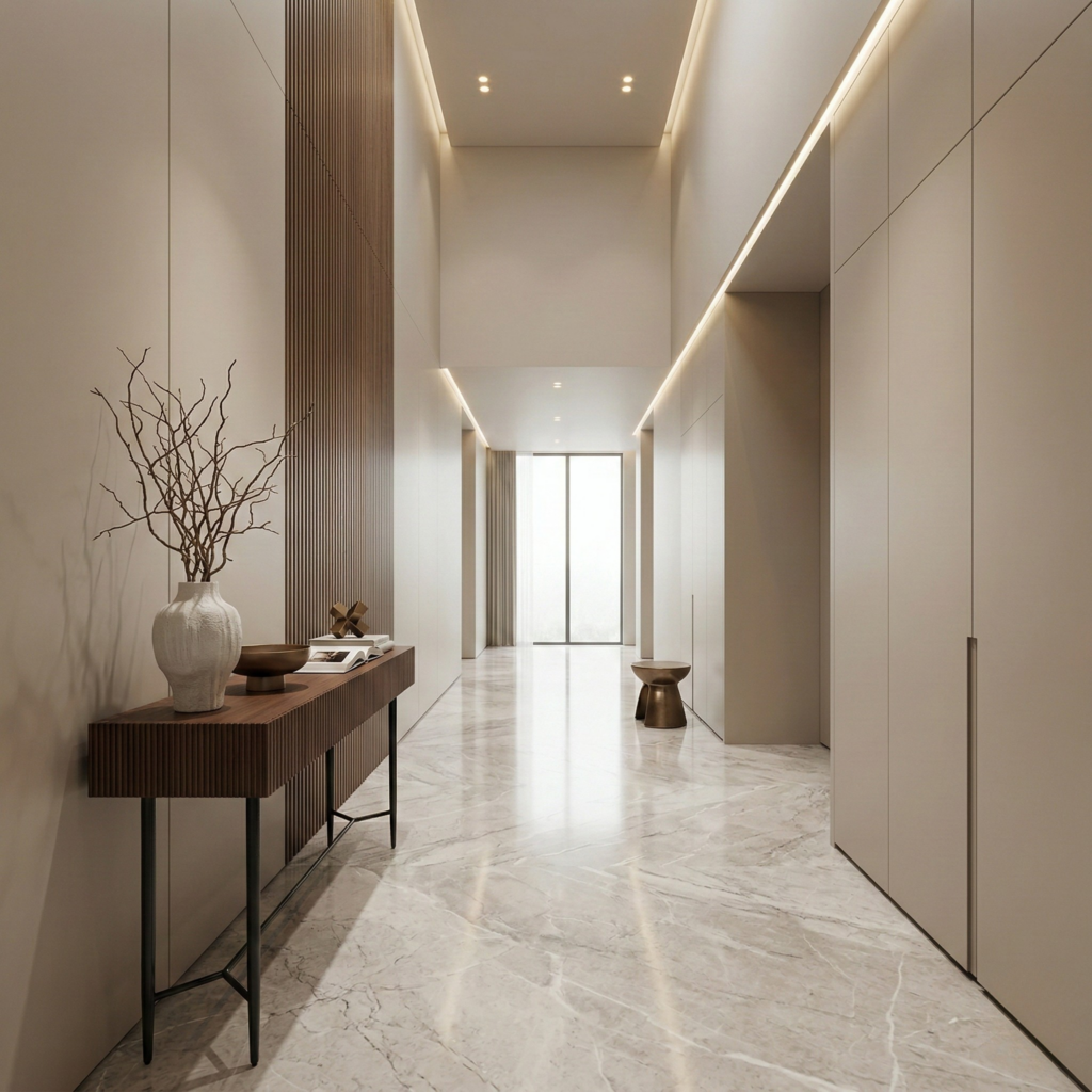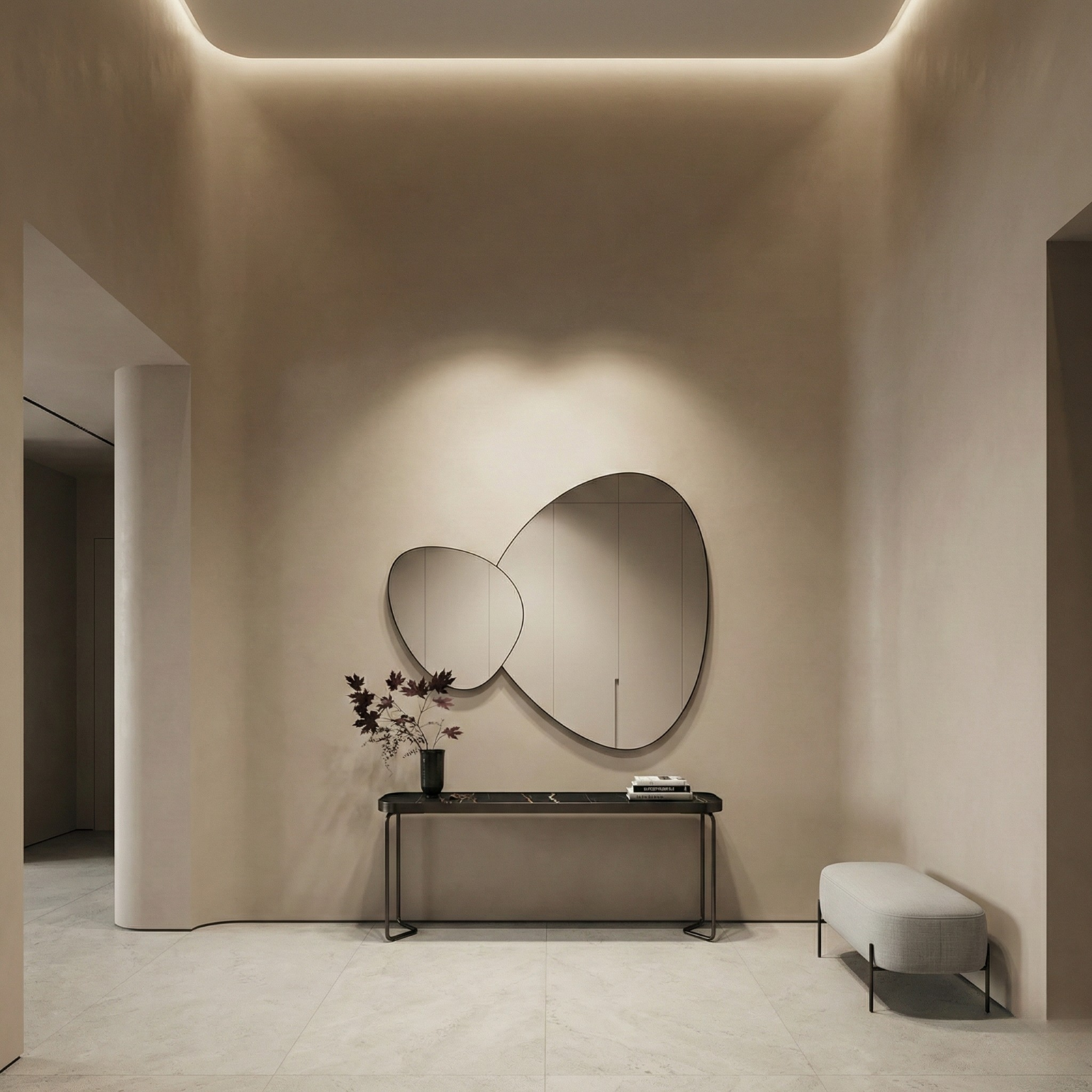 Antica pairs a refined sintered stone top with a minimal stainless steel base, creating a clean, elevated presence in entryways, corridors, and living spaces. The silhouette stays close to the wall, offering a functional surface without visual weight.
