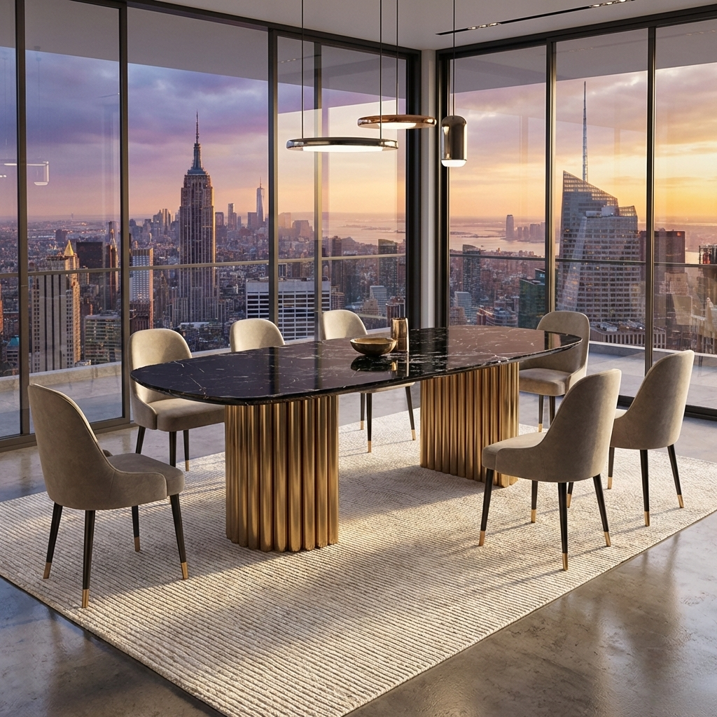 Aphra Dining Table hadir sebagai solusi yang menyeluruh. Dengan struktur stainless steel berkualitas tinggi, finishing emas Jepang yang tahan lama, serta dudukan marmer hitam matte berlapis resin, Aphra menawarkan kombinasi ideal antara kekuatan, kemudahan perawatan, dan estetika modern. Kursi ini dirancang untuk penggunaan intensif tanpa kehilangan pesona—memberikan rasa aman, nyaman, dan percaya diri dalam setiap momen duduk.