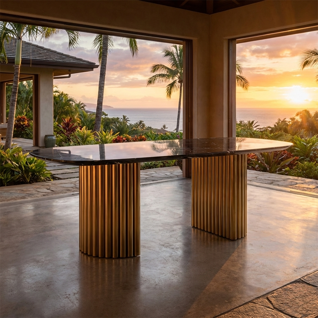 - Kombinasi logam emas Jepang dan marmer hitam matte menciptakan kontras visual yang dramatis namun seimbang