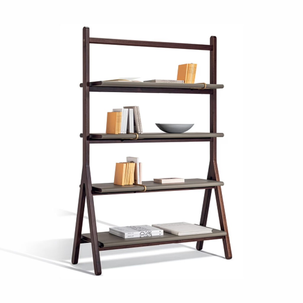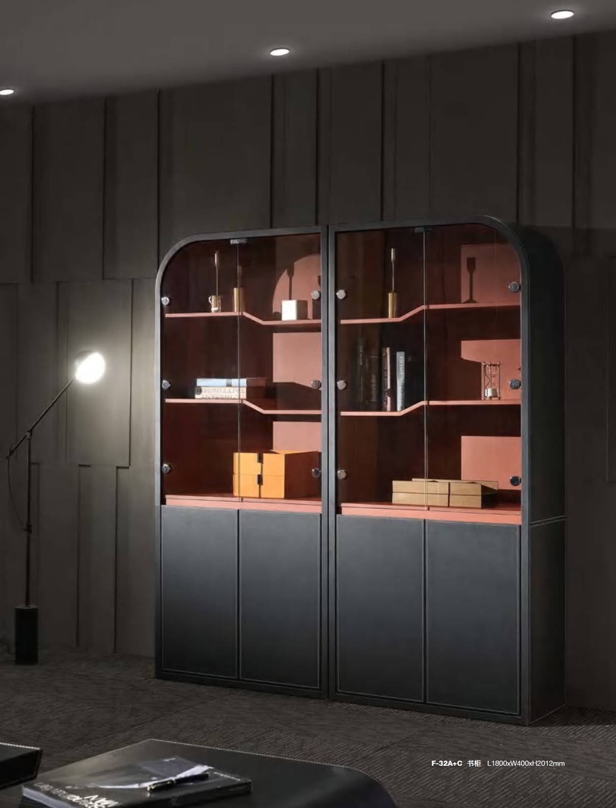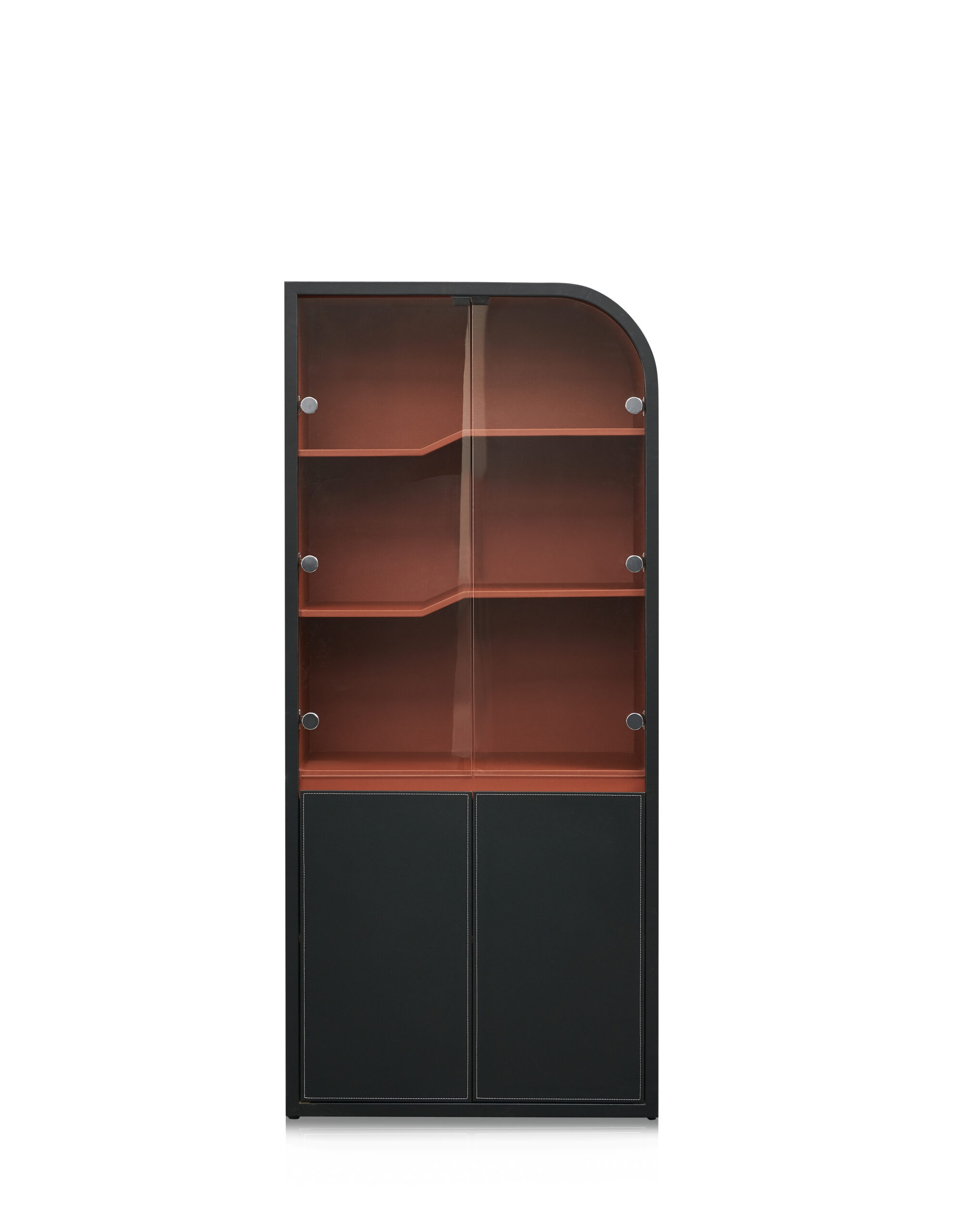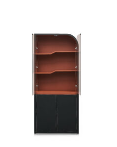 Its architectural silhouette is characterized by softened curves and a composed vertical rhythm, creating a strong yet elegant presence within the room. Transparent glass panels introduce visual lightness while allowing select items to be displayed with intention—books, awards, artifacts, or design objects—without overwhelming the space. Below, concealed leather-wrapped compartments provide discreet storage, maintaining visual clarity and organizational discipline.