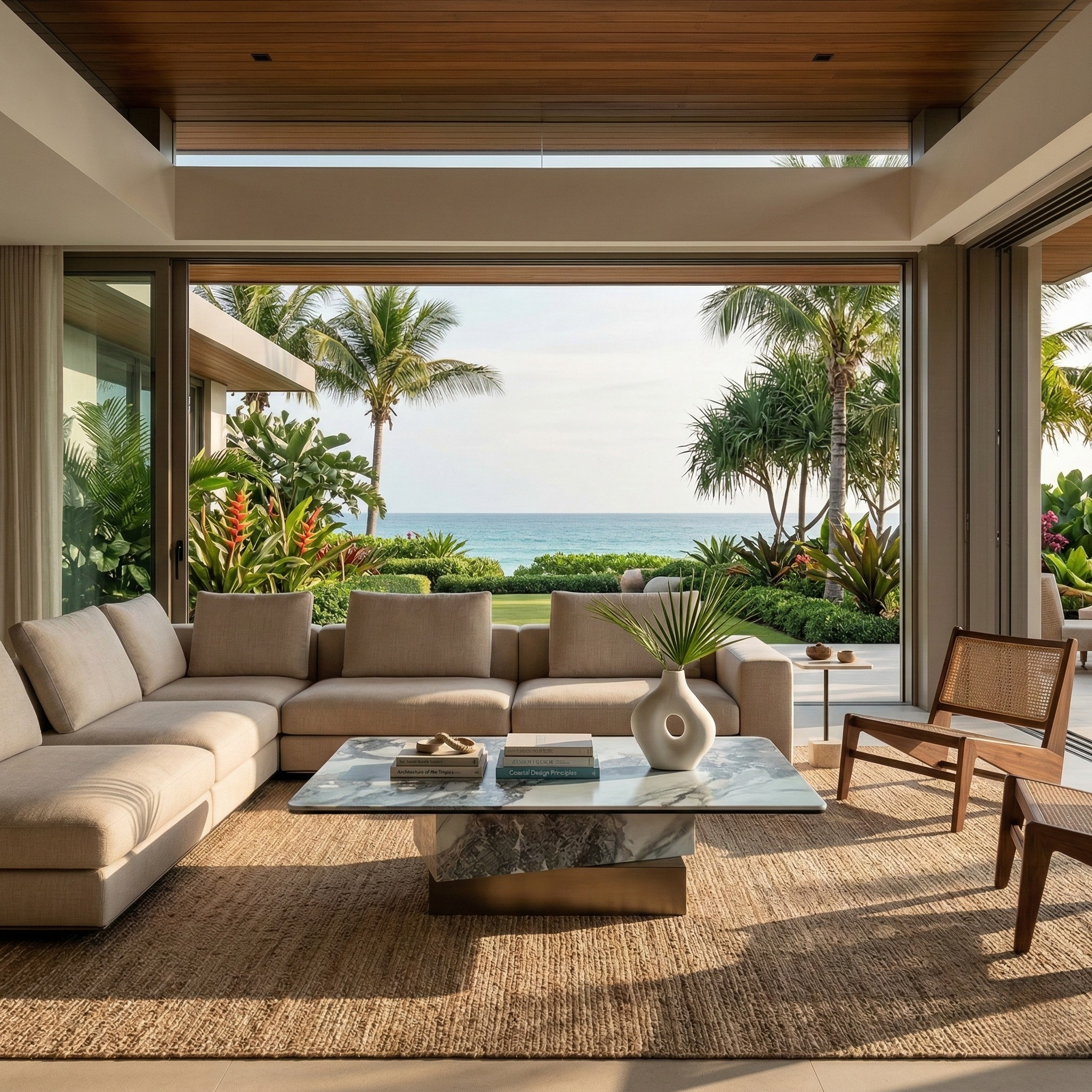 A composed, low-profile coffee table that layers ceramic, glass, and wood into a precise architectural statement.