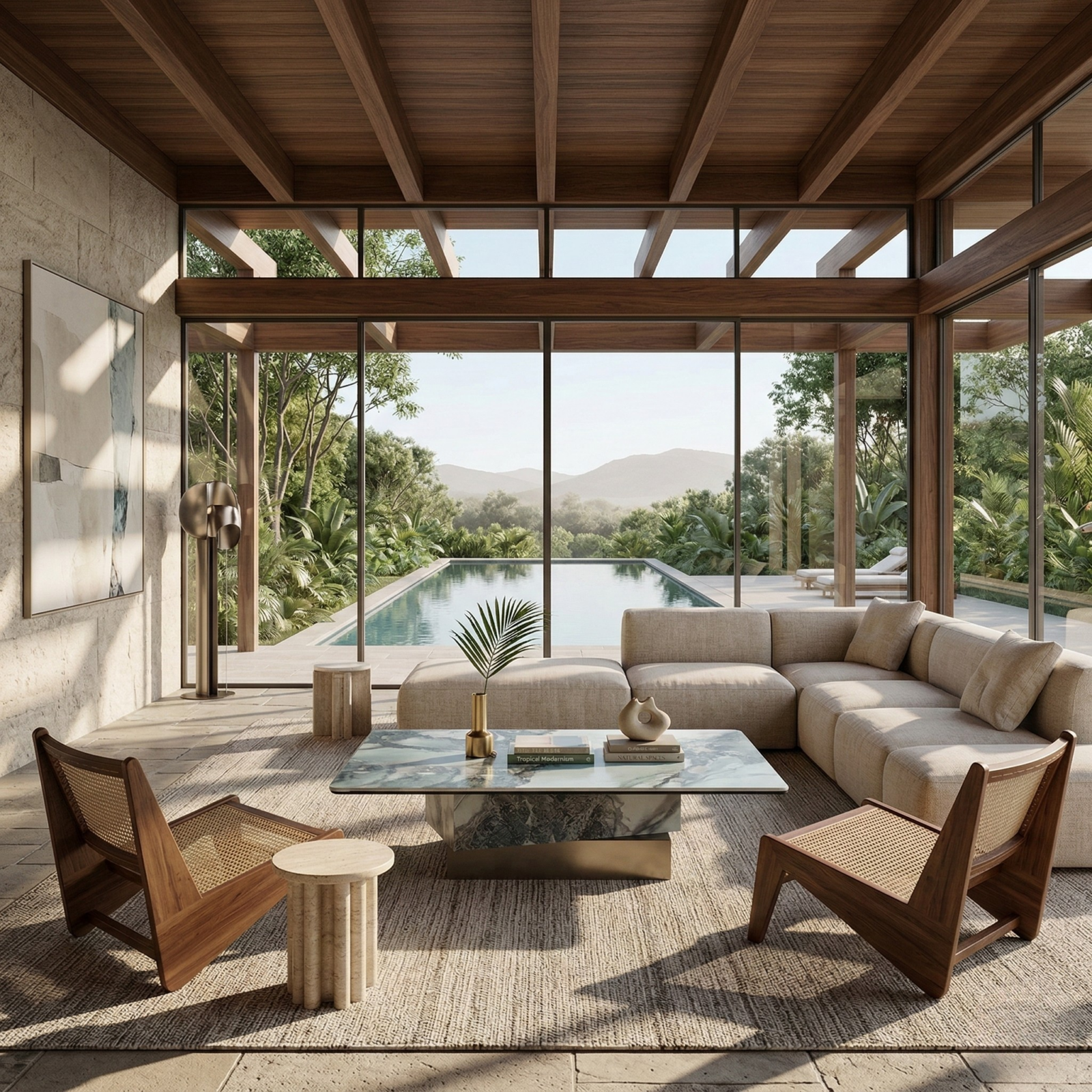 A composed, low-profile coffee table that layers ceramic, glass, and wood into a precise architectural statement.