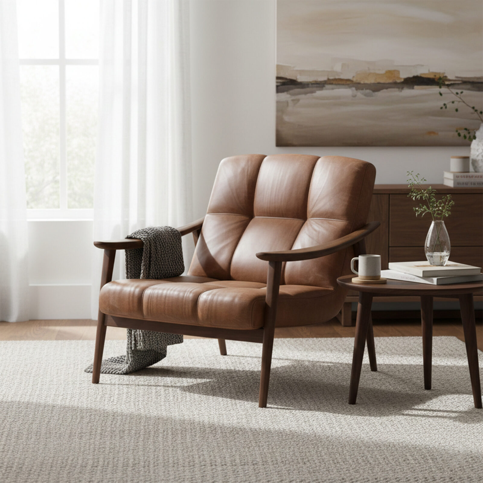 - Interior bergaya mid-century, contemporary, atau modern classic yang menonjolkan keindahan material alami.