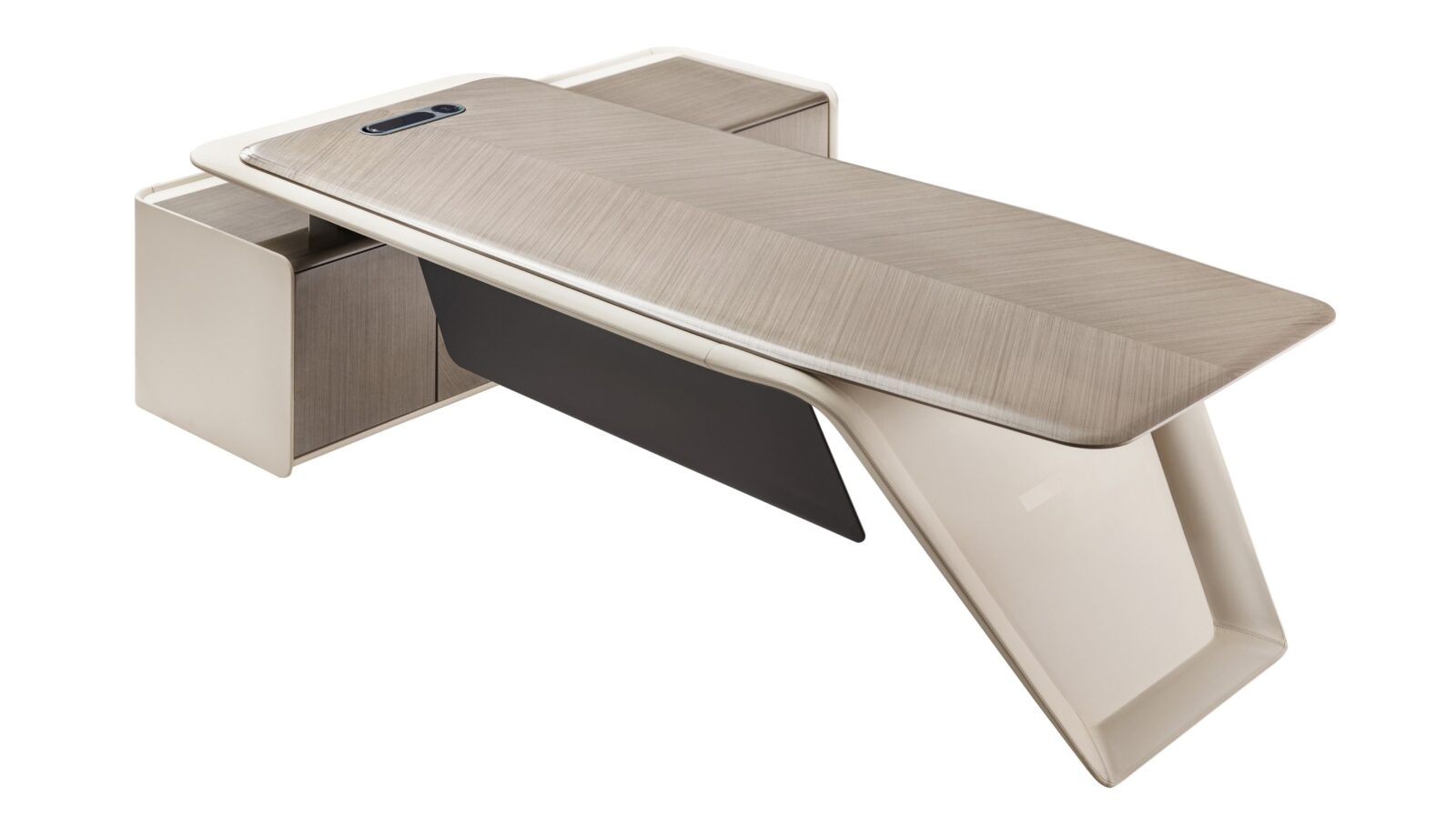 The deskās silhouette is defined by continuous curves and softened edges, evoking the language of contemporary Italian architecture. Upholstered bases wrap the structure like tailored leather couture, while the surfaceācrafted in fine wood veneer or natural stoneārests above with an almost suspended elegance. Subtle metal accents introduce a restrained sense of luxury, never decorative, always intentional.