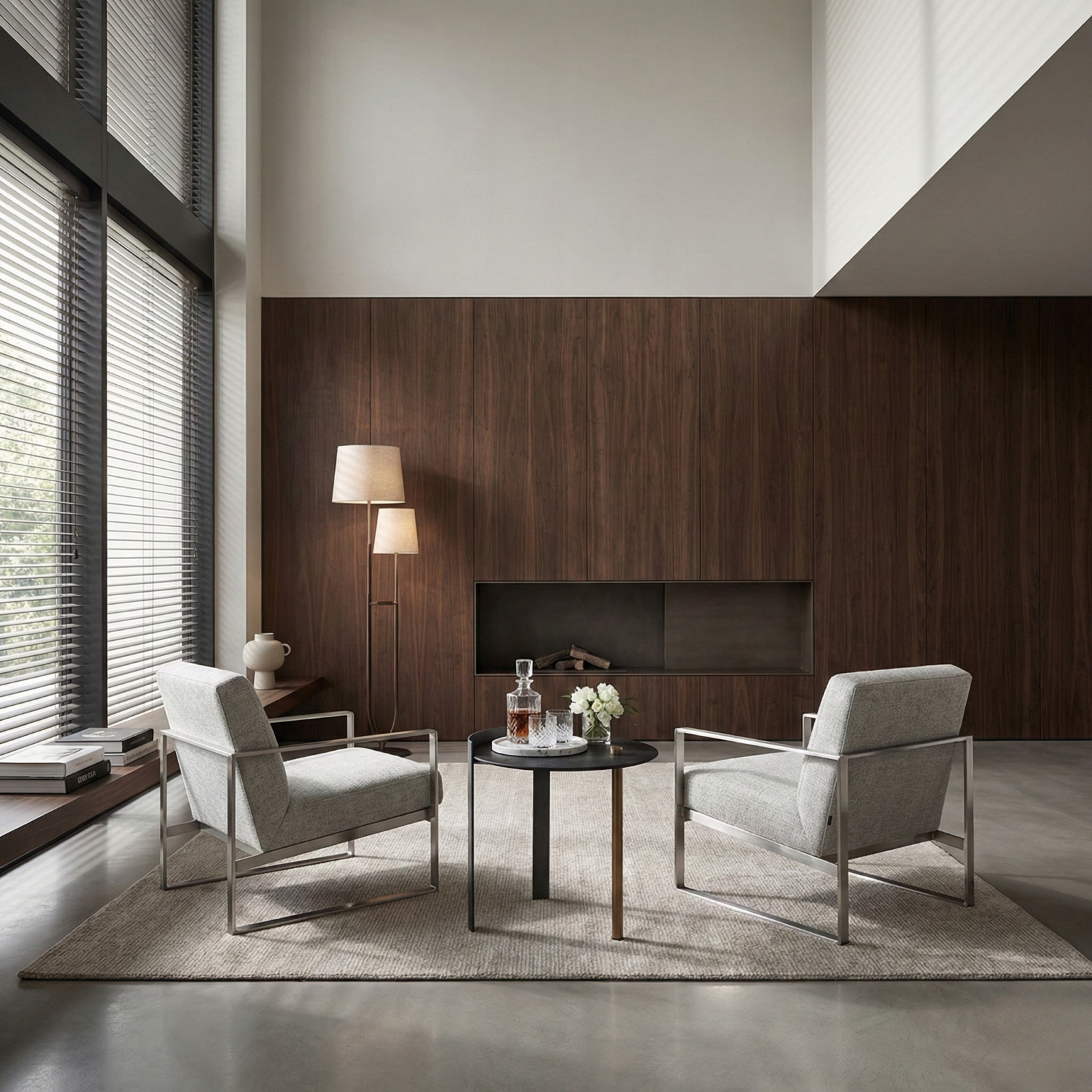 Sized at 55 cm square with a 51 cm height, Battista suits small seating groups, reading corners, and hospitality lounges where a compact footprint and strong detailing matter.