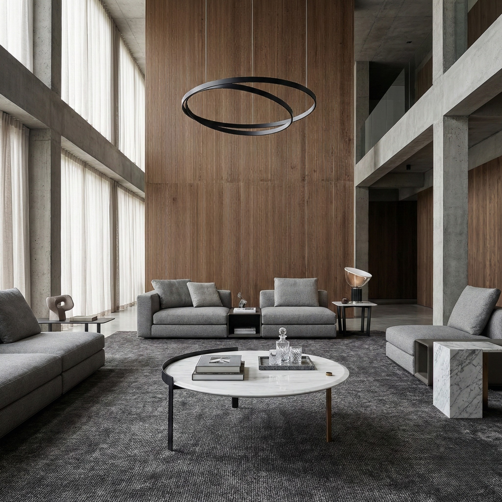 A circular marble coffee table with a slender metal base, composed to sit quietly at the centre of the room.