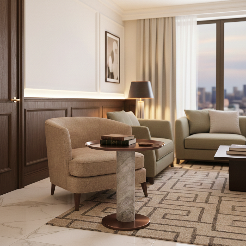 - Posisikan di sisi armchair pada area ruang tamu atau suite hotel mewah guna menciptakan sudut bersantai yang elegan.