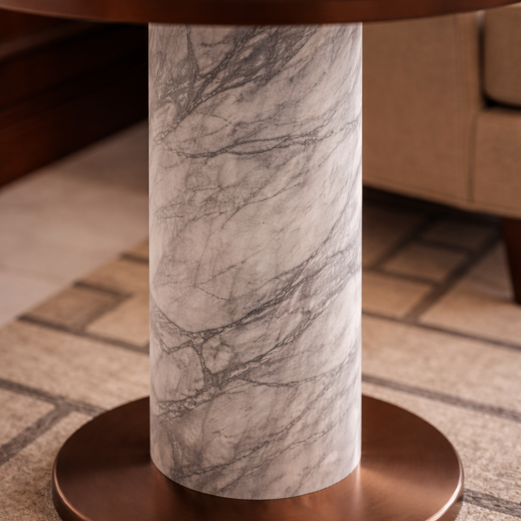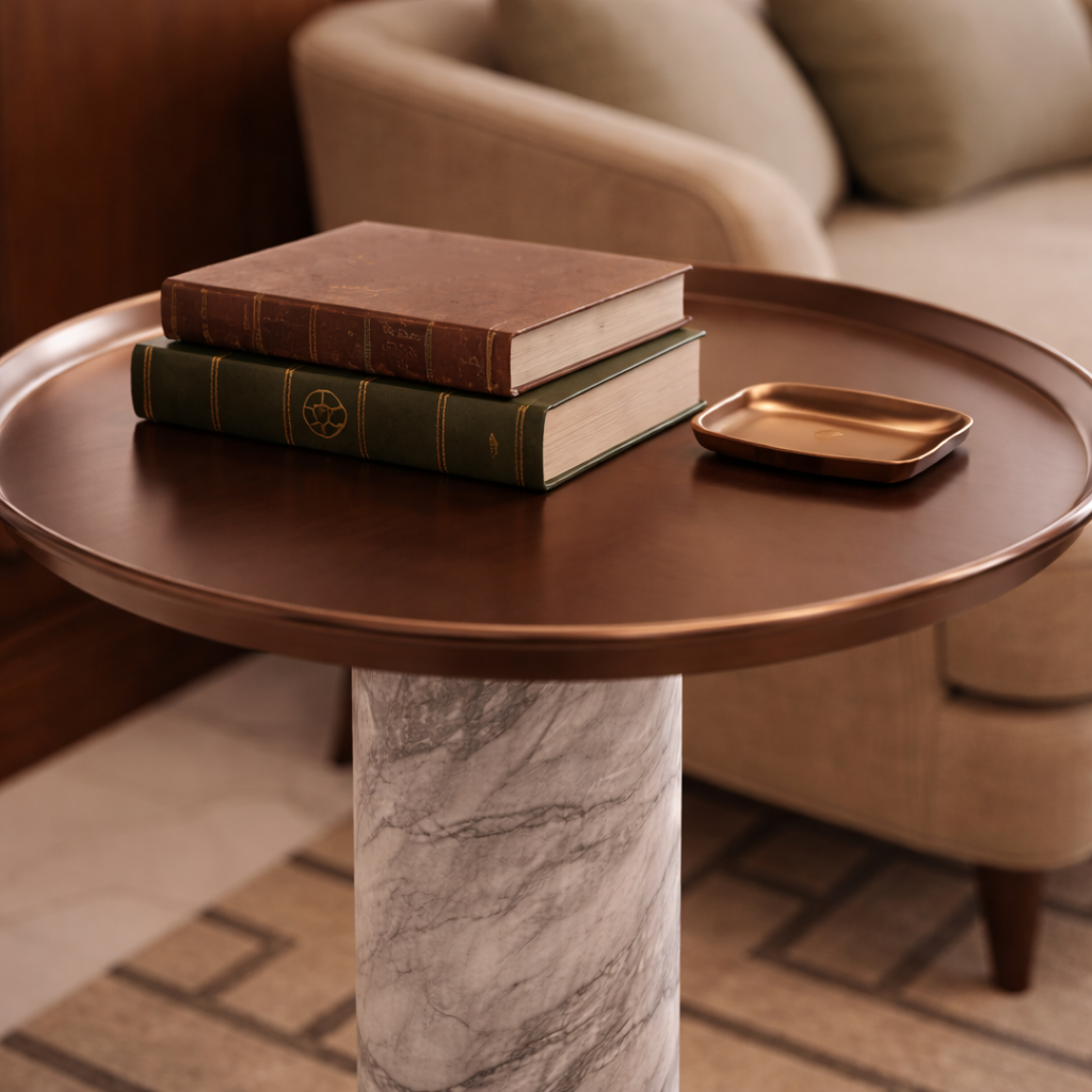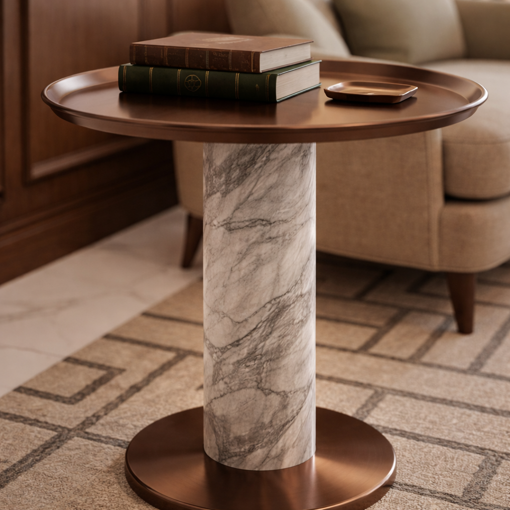 - Padukan dengan aksesori meja bermaterial kulit atau kayu gelap guna menonjolkan kilau tembaga dan urat marmer yang eksklusif.