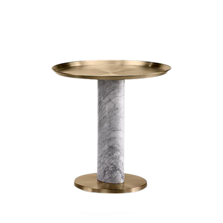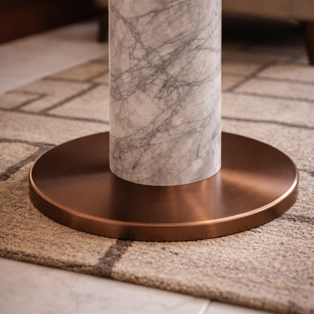 Boyce Side Table adalah perwujudan gaya kontemporer mewah yang memadukan keanggunan White Carrara Marble dengan rangka stainless steel brushed bronze yang eksotis. Dirancang sebagai pendamping sofa atau armchair kelas atas, meja ini menawarkan keseimbangan sempurna antara kekuatan struktural dan keindahan mineral alami.