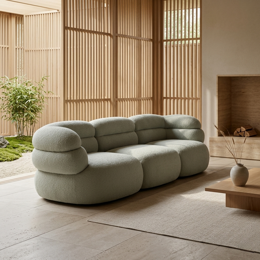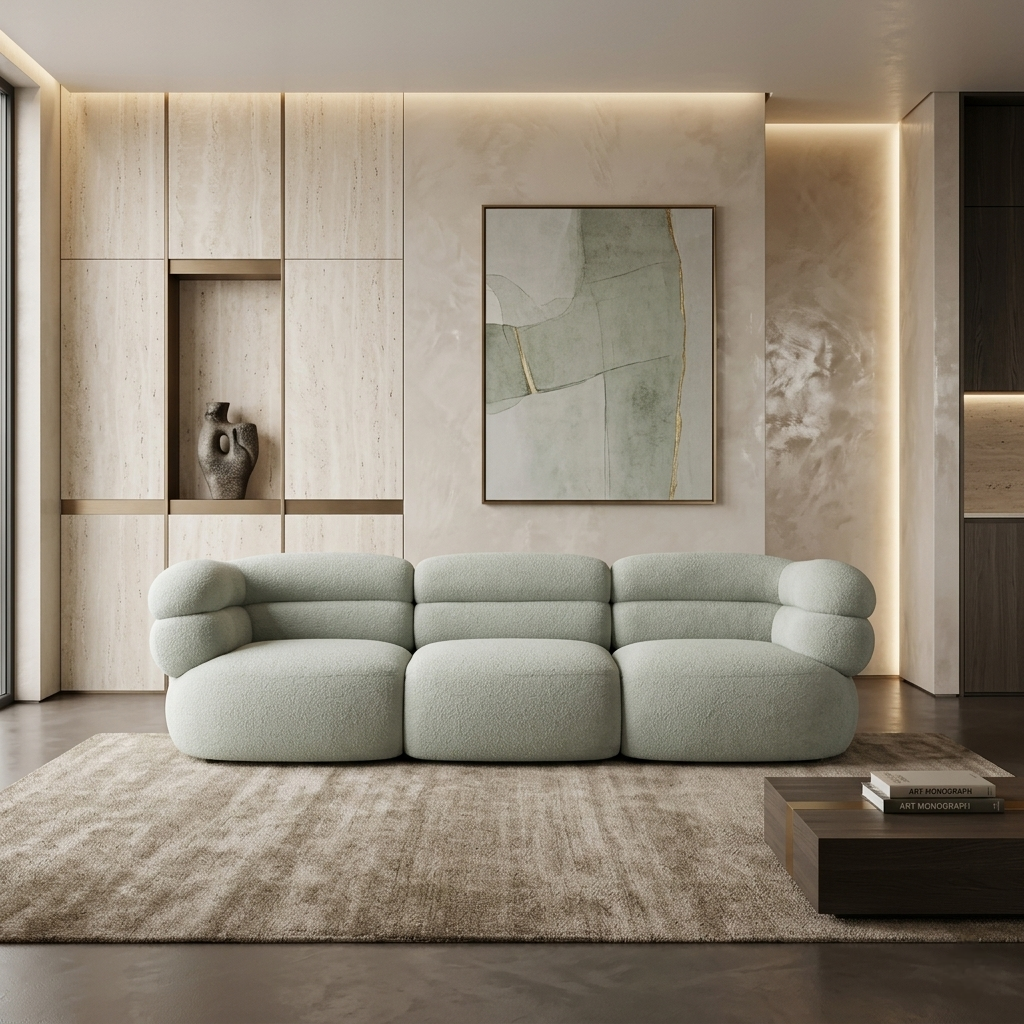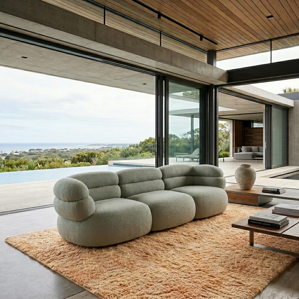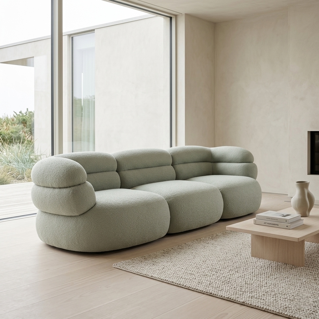 A sculptural curved sofa defined by soft volumes, layered cushioning, and a bold architectural silhouette.