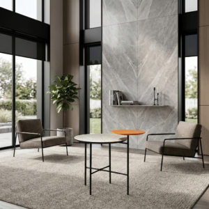 A ceramic tabletop brings a clean, stone-like presence, while the lower surface in MDF with black veneer adds depth and tonal warmth. The contrast is quiet and deliberate, designed to sit comfortably alongside upholstered seating or within curated lounge settings.