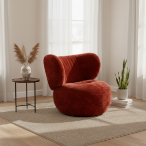 Chubo Lounge Chair Terracotta Fabric memiliki fleksibilitas tinggi untuk berbagai gaya ruang, menjadikannya elemen aksen yang mudah dipadukan.