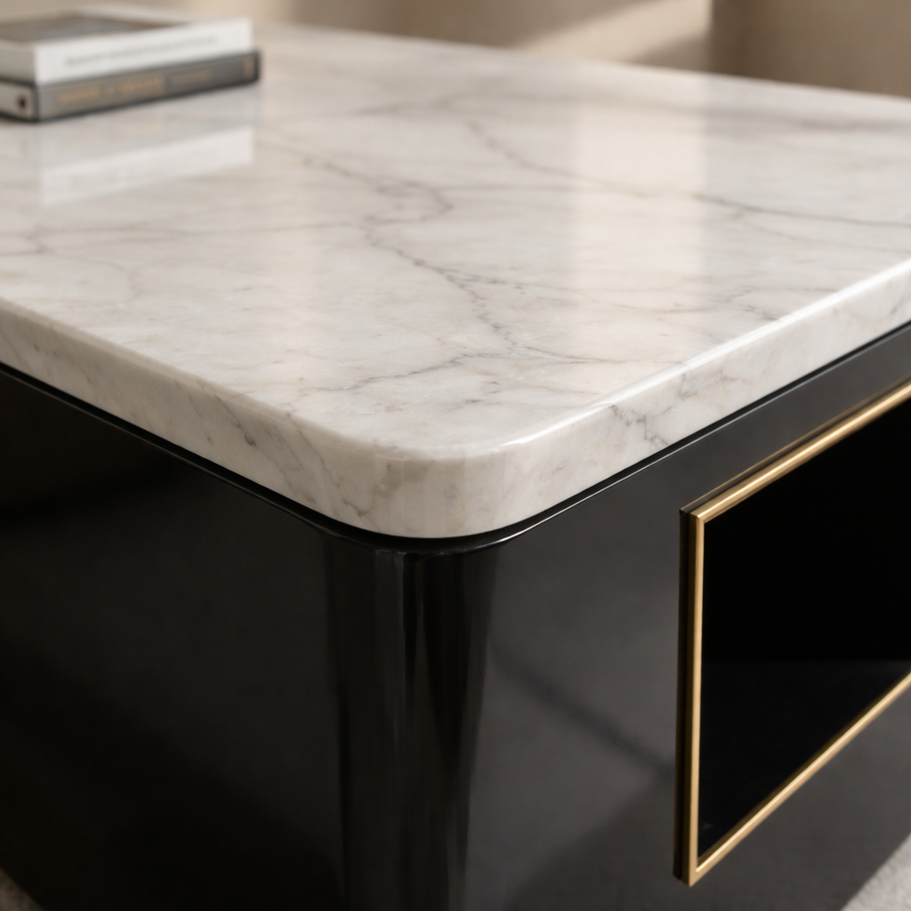 - Top meja terbuat dari marble Carrara putih asli yang menampilkan tekstur halus dan warna cerah alami