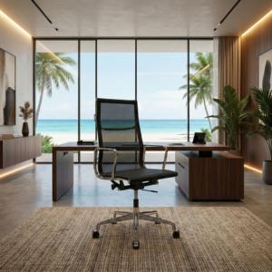 Eames Aluminium Executive Mesh (With Castor) presents a clean, structured profile with a high back and a chromed finish that reads crisp against modern interiors. The mesh backrest keeps the form visually light, while the seat supports focused work across long sessions.