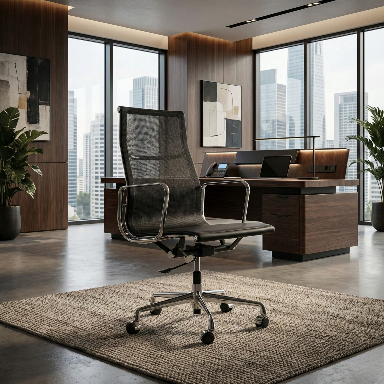 Eames Aluminium Executive Mesh (With Castor) presents a clean, structured profile with a high back and a chromed finish that reads crisp against modern interiors. The mesh backrest keeps the form visually light, while the seat supports focused work across long sessions.
