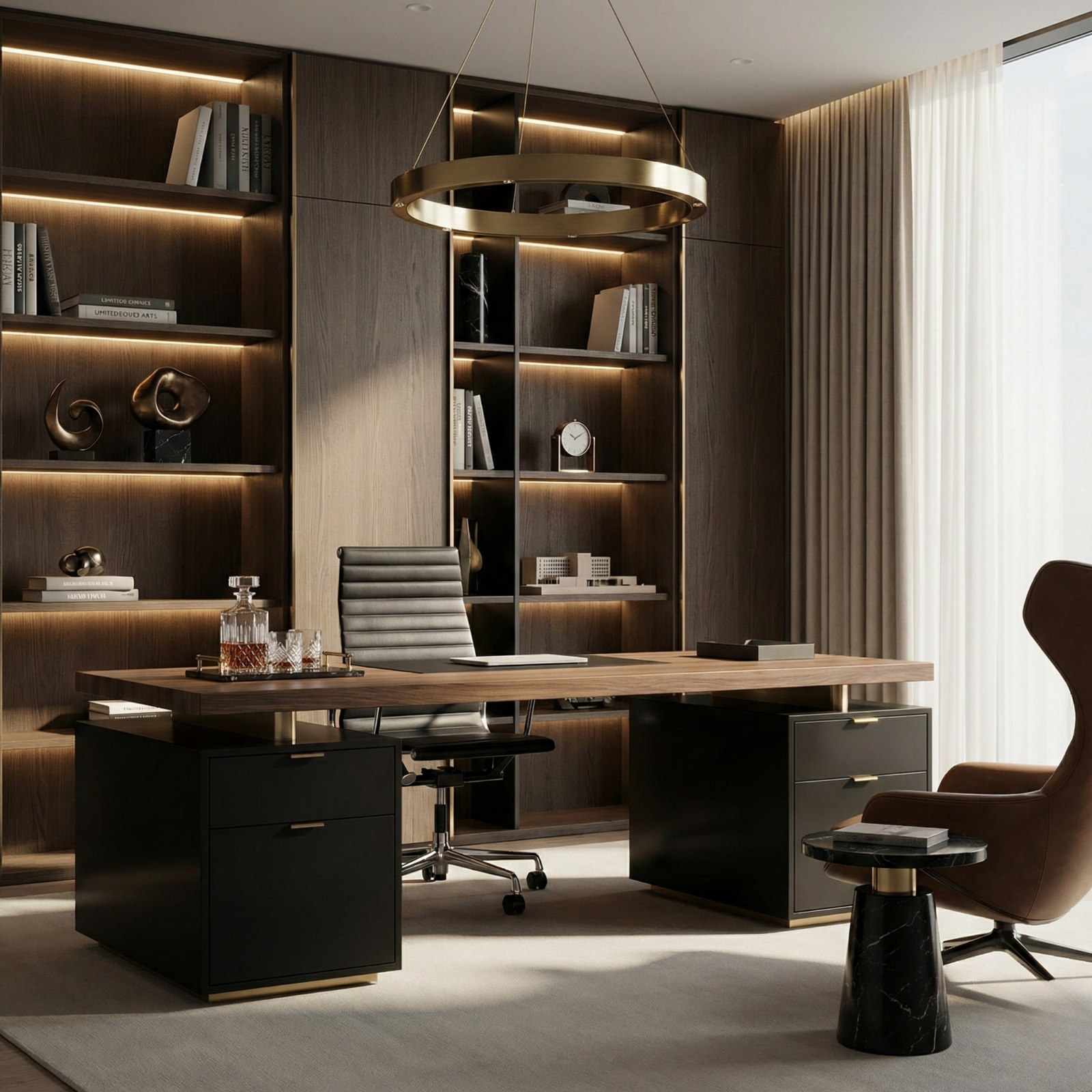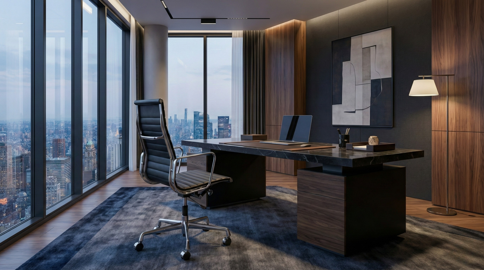 An executive chair with a crisp aluminium profile, black leather finish, and smooth castor mobility, built for modern work settings.