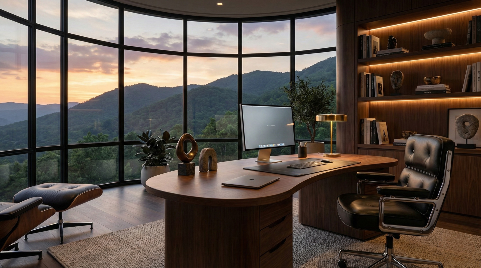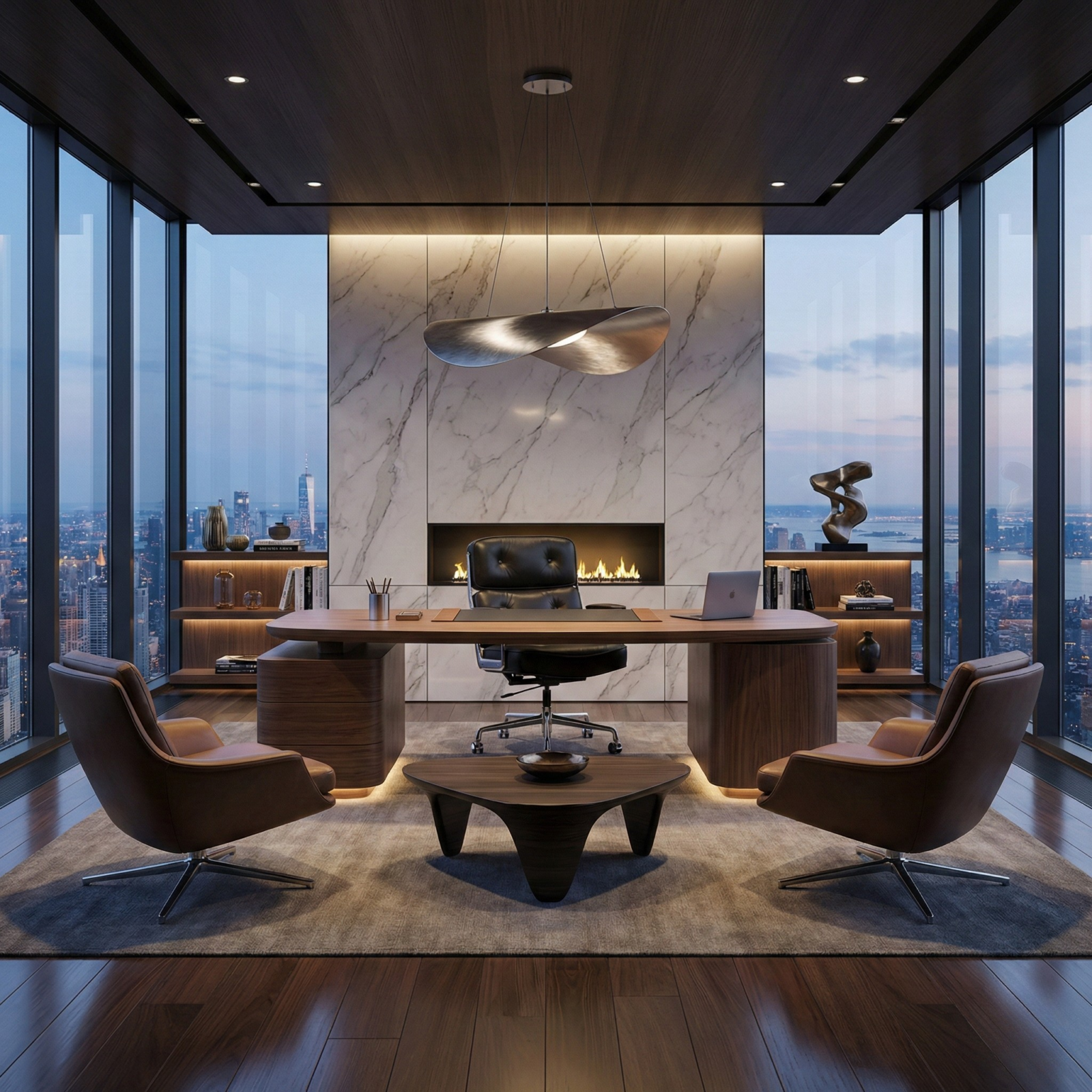 An iconic executive chair with sculpted cushioning and a polished metal base, upholstered in Italian leather for a refined office presence.