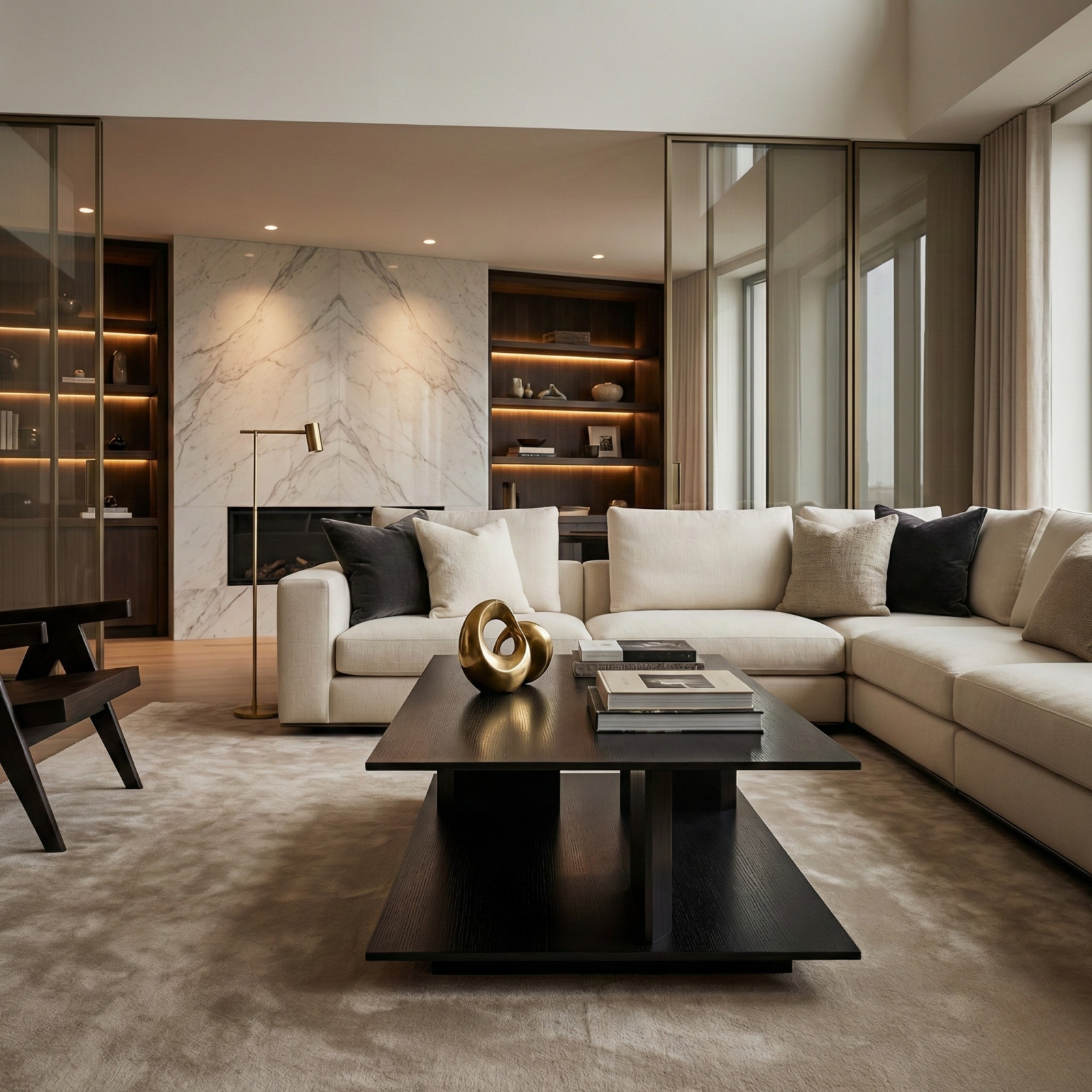 A low, architectural coffee table defined by stacked planes and a calm, grounded profile.