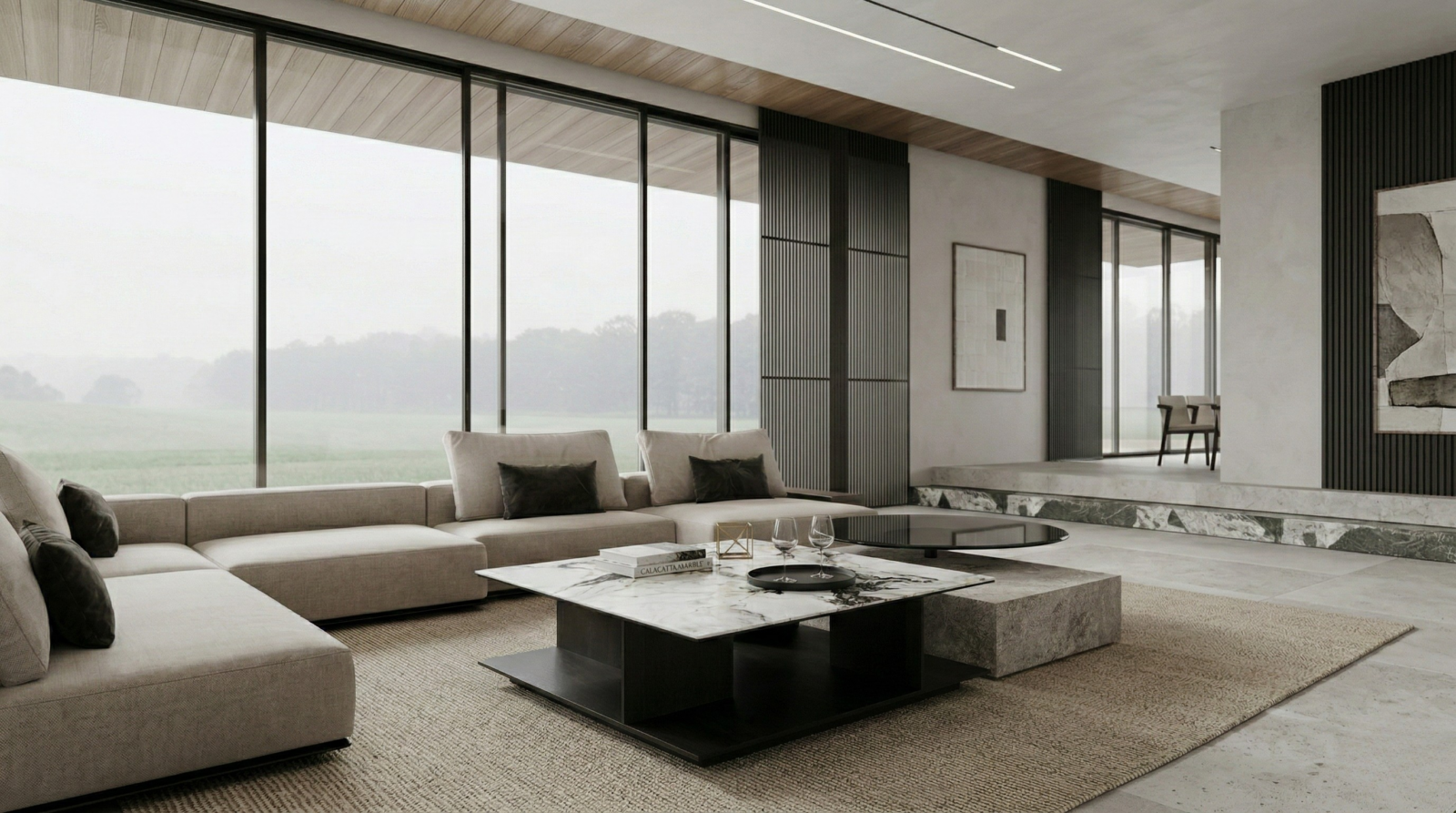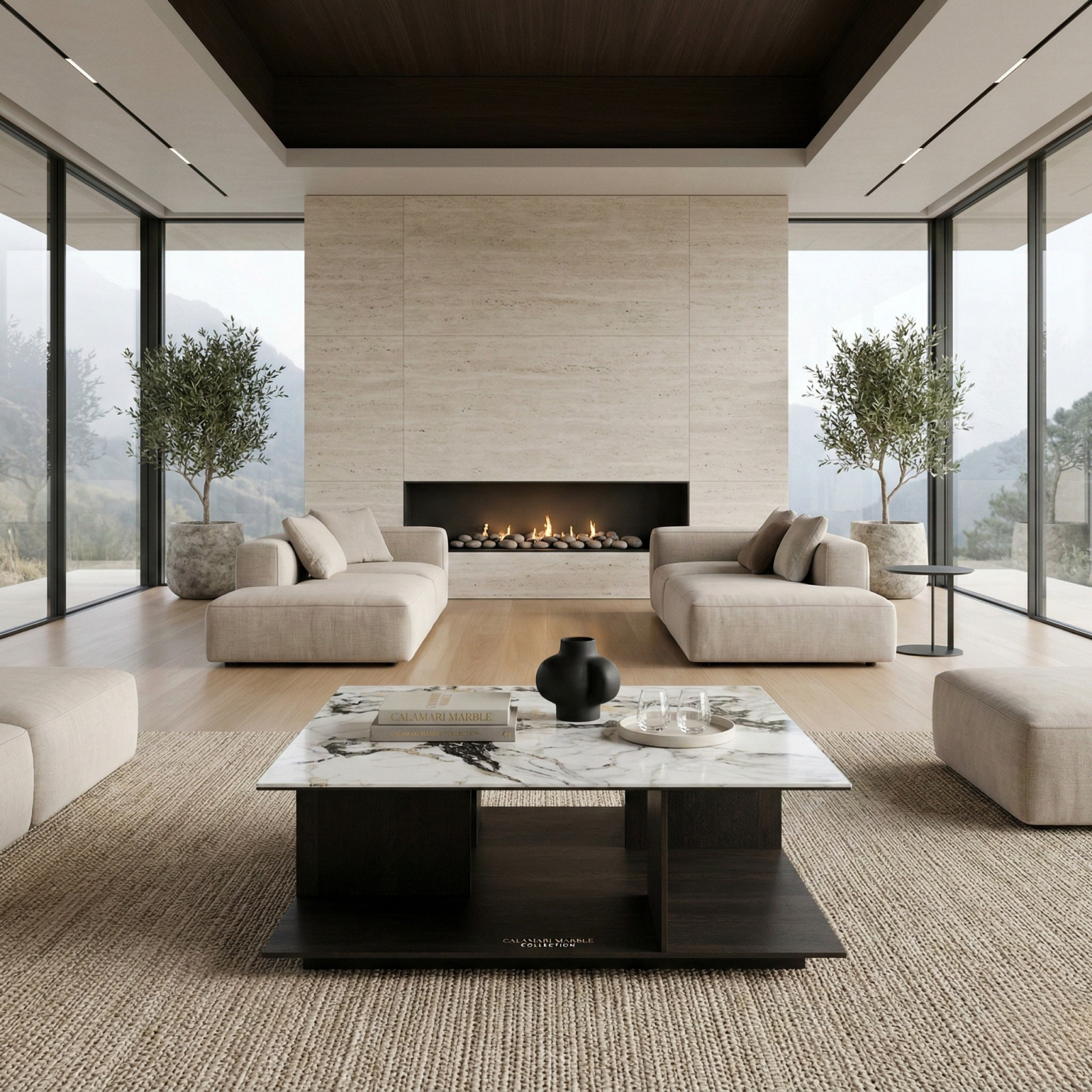 A low, architectural coffee table that pairs a crisp sintered stone surface with a structured veneer base and refined metal detailing.