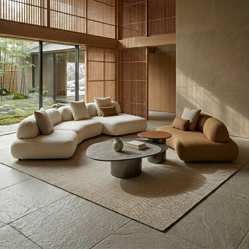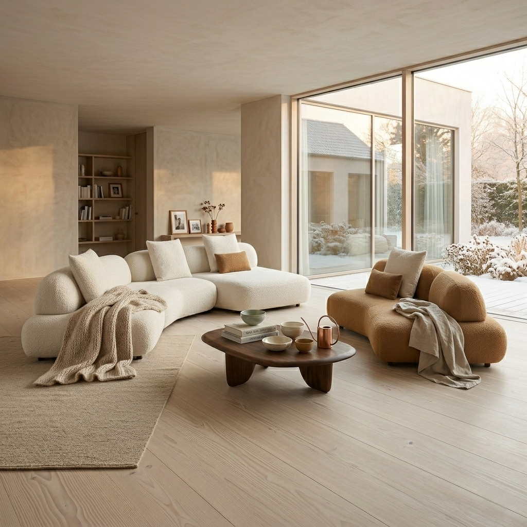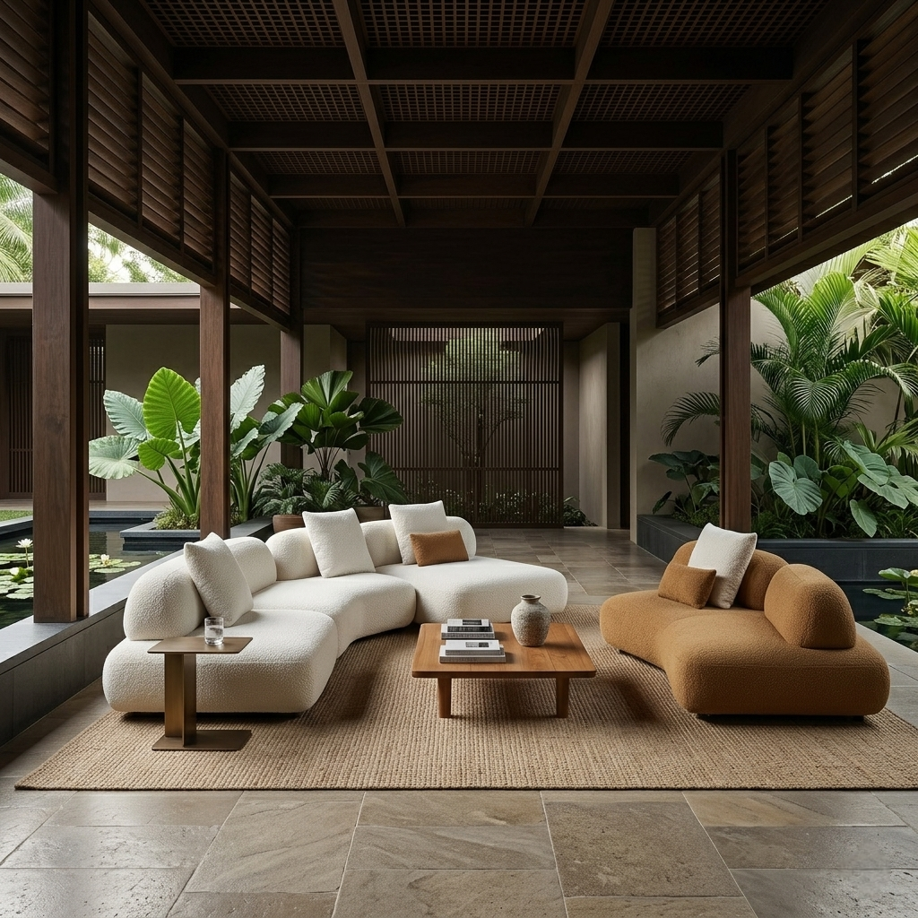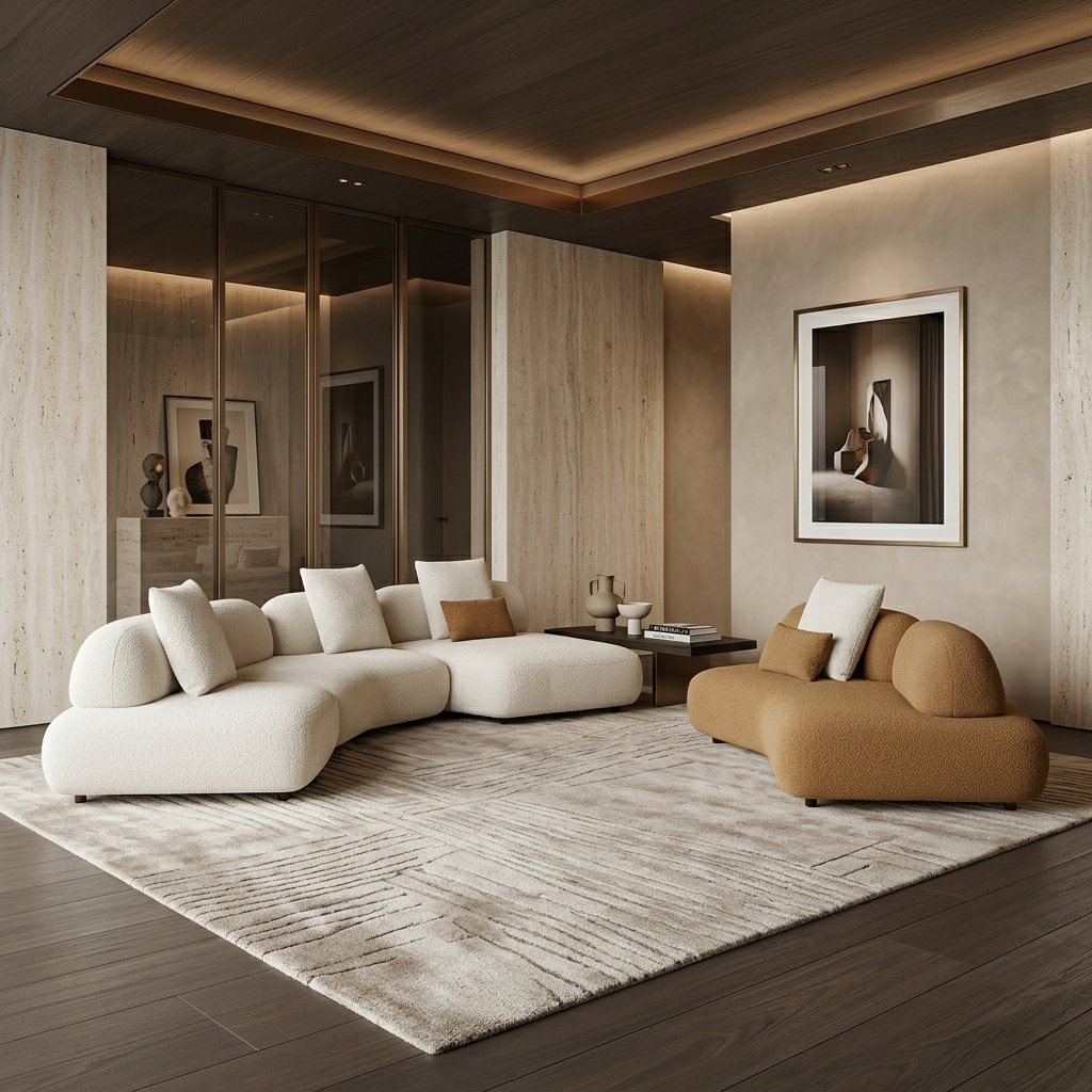 Elvano is defined by its organic curved modules and generous proportions, forming a sofa system that feels fluid, inviting, and visually calm. The design moves away from rigid linear seating and instead introduces gentle curves that allow the sofa to shape the space naturally.