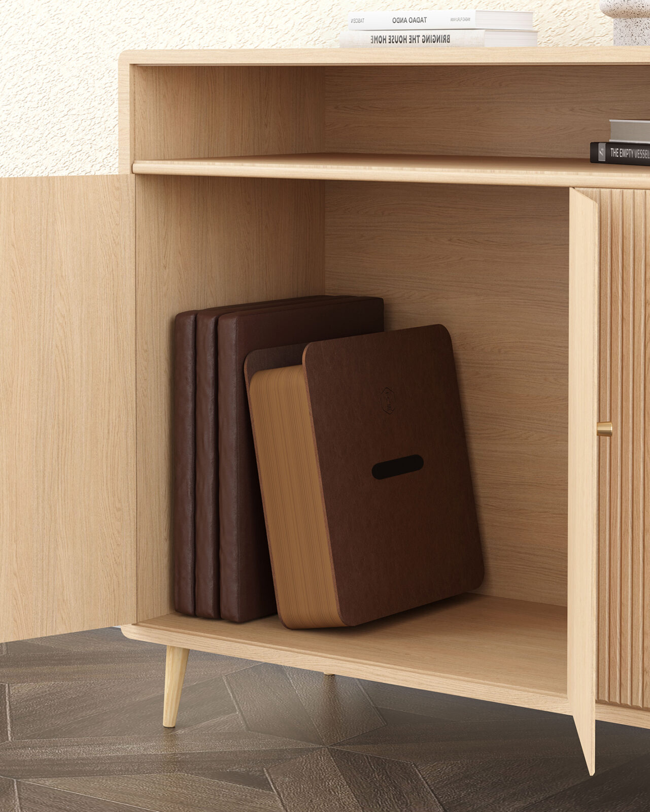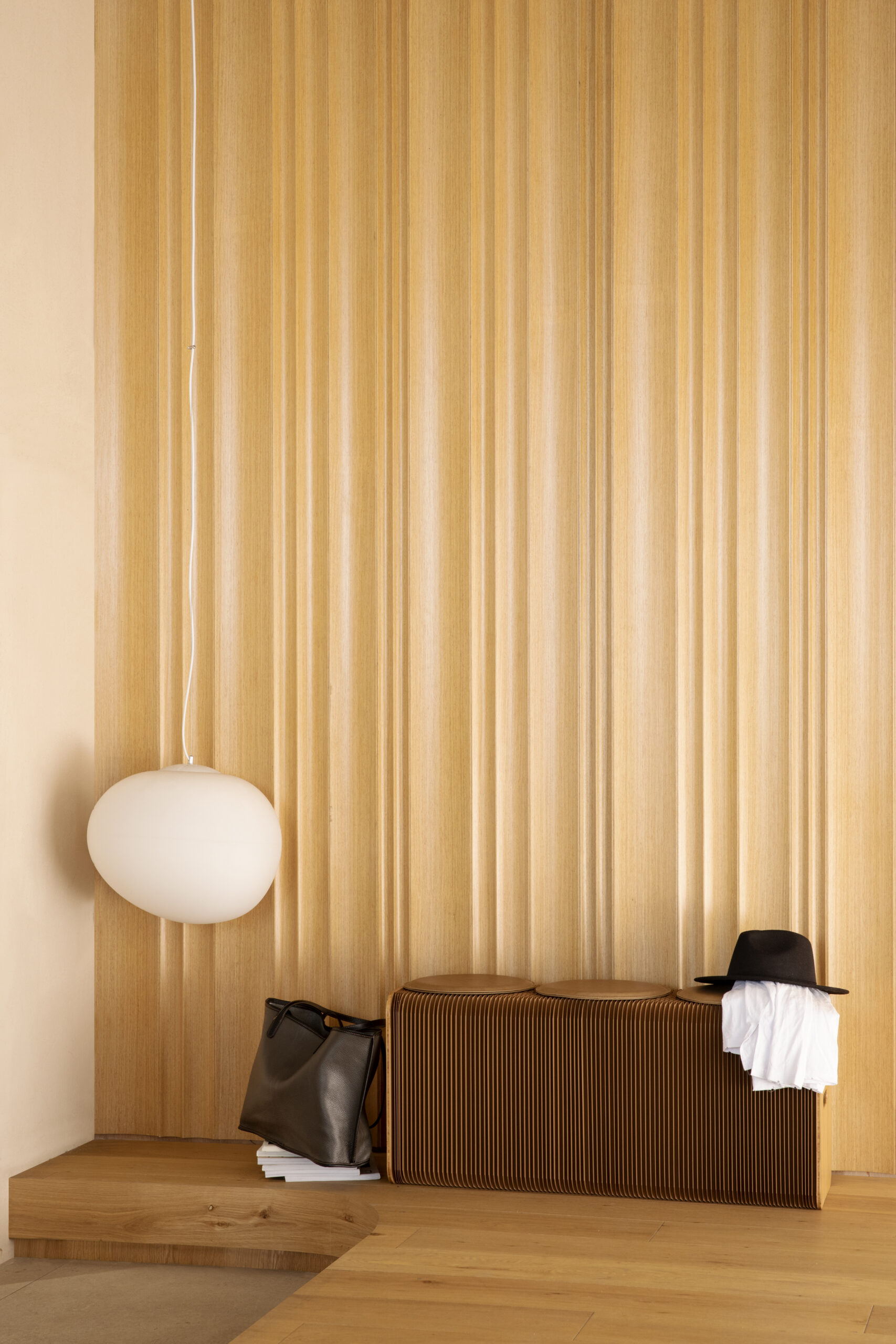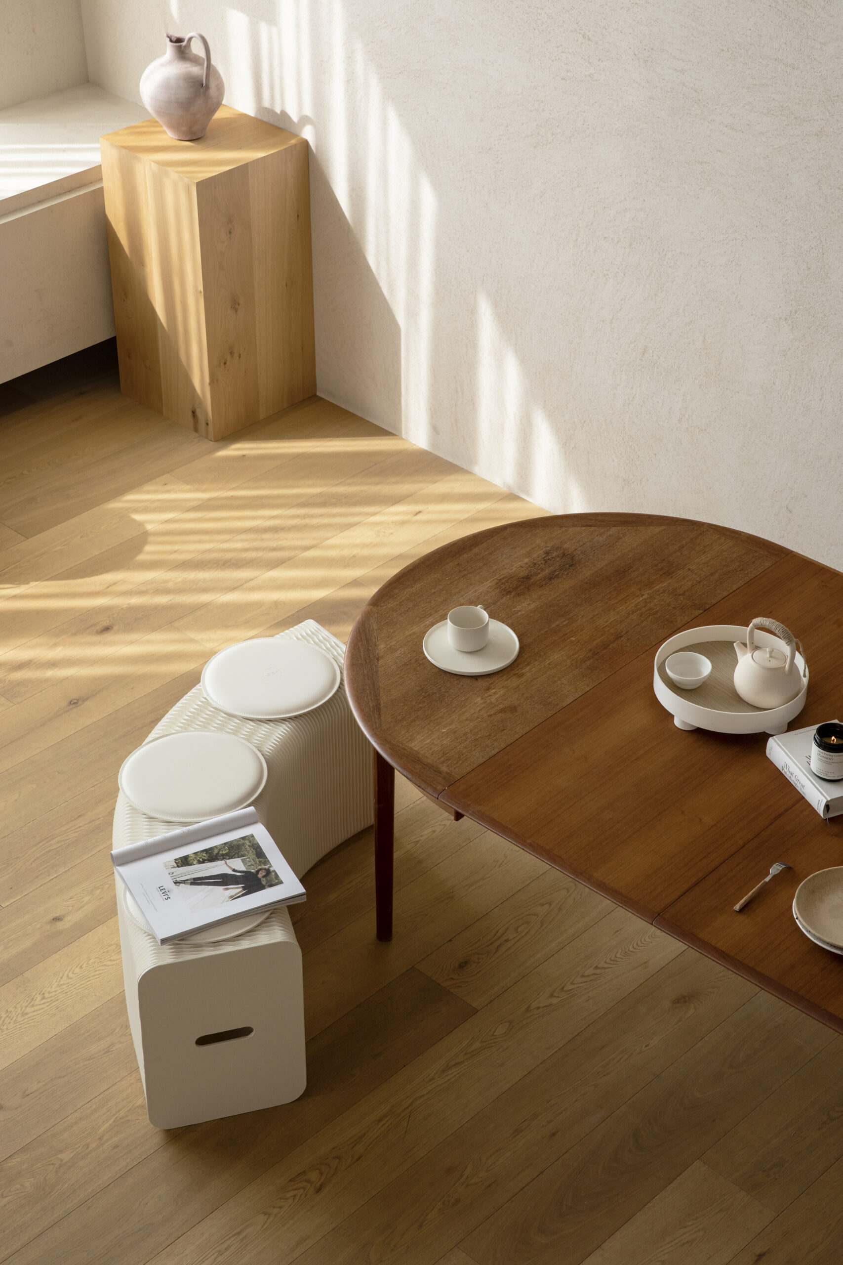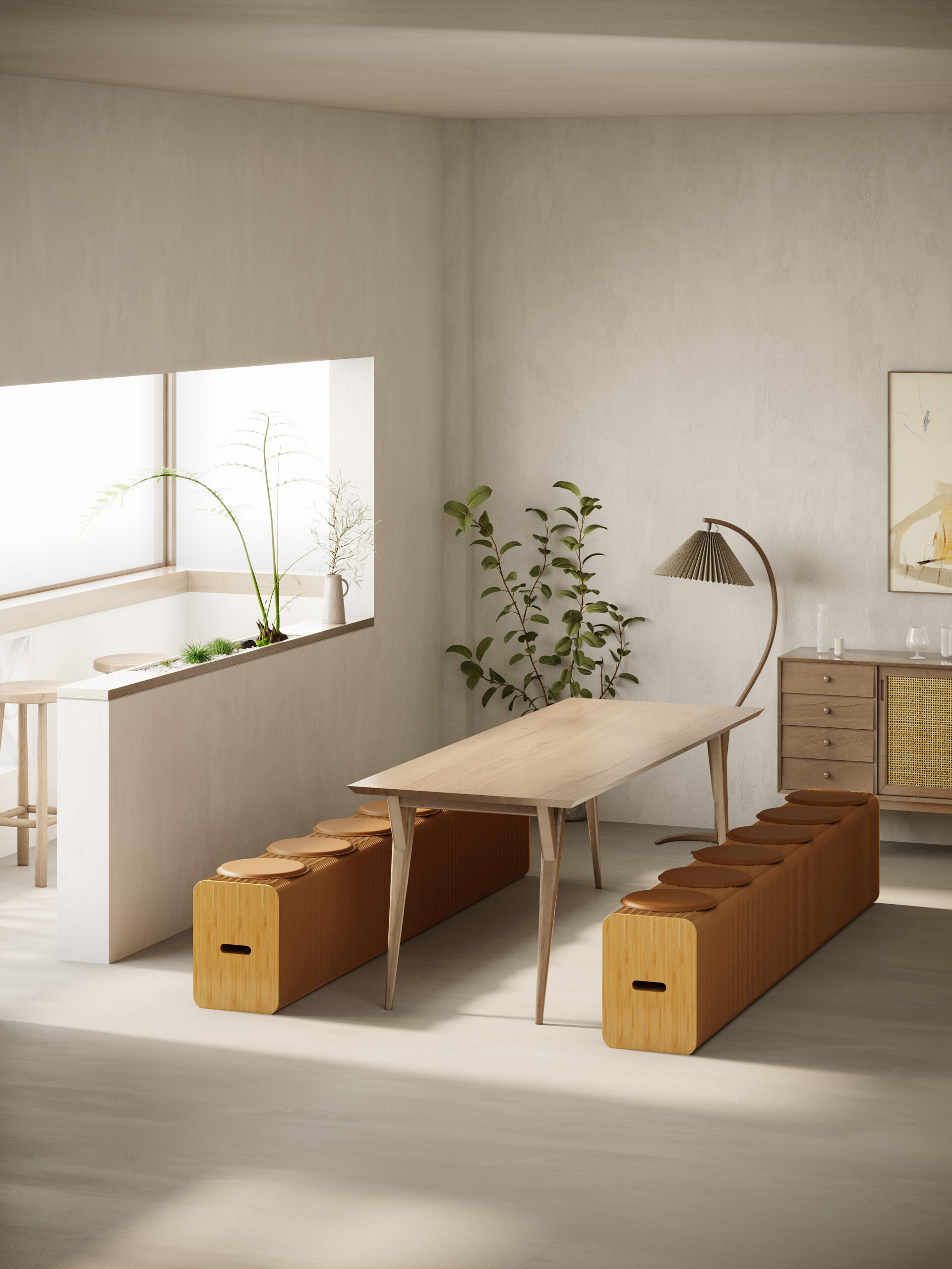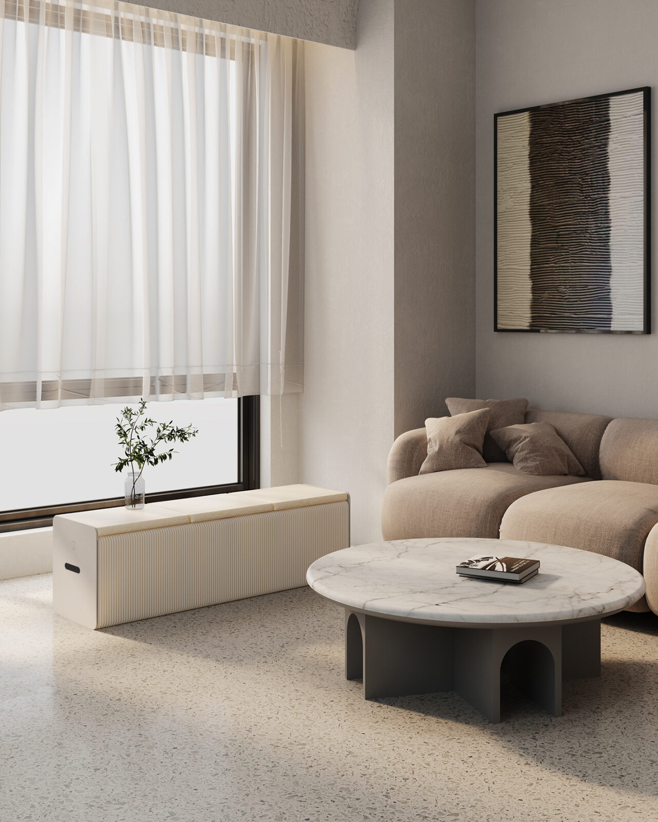 Designed to expand, curve, and reconfigure with ease, FLEXA also includes integrated hidden storage to keep essentials neatly tucked away while maintaining a clean, refined look. The ribbed texture adds visual rhythm and tactile warmth, turning this piece into a functional design statement.