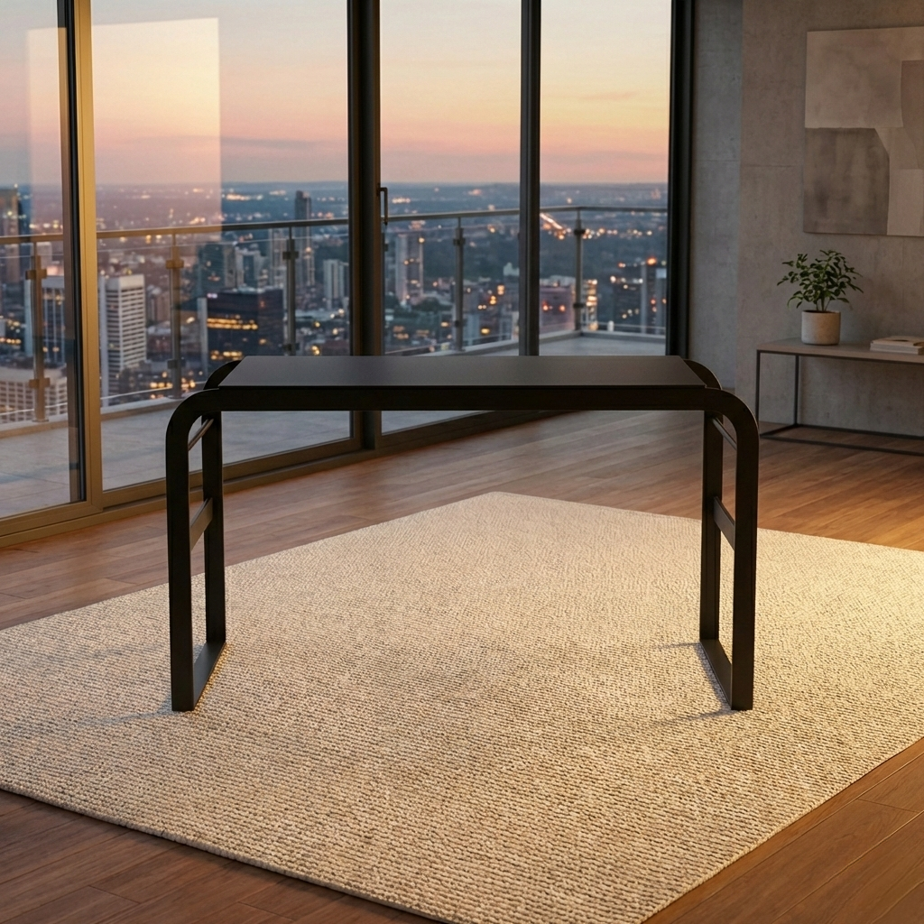 - Rangka meja terbuat dari logam berwarna hitam dengan struktur yang presisi, menghadirkan kestabilan tinggi dan karakter modern yang tegas