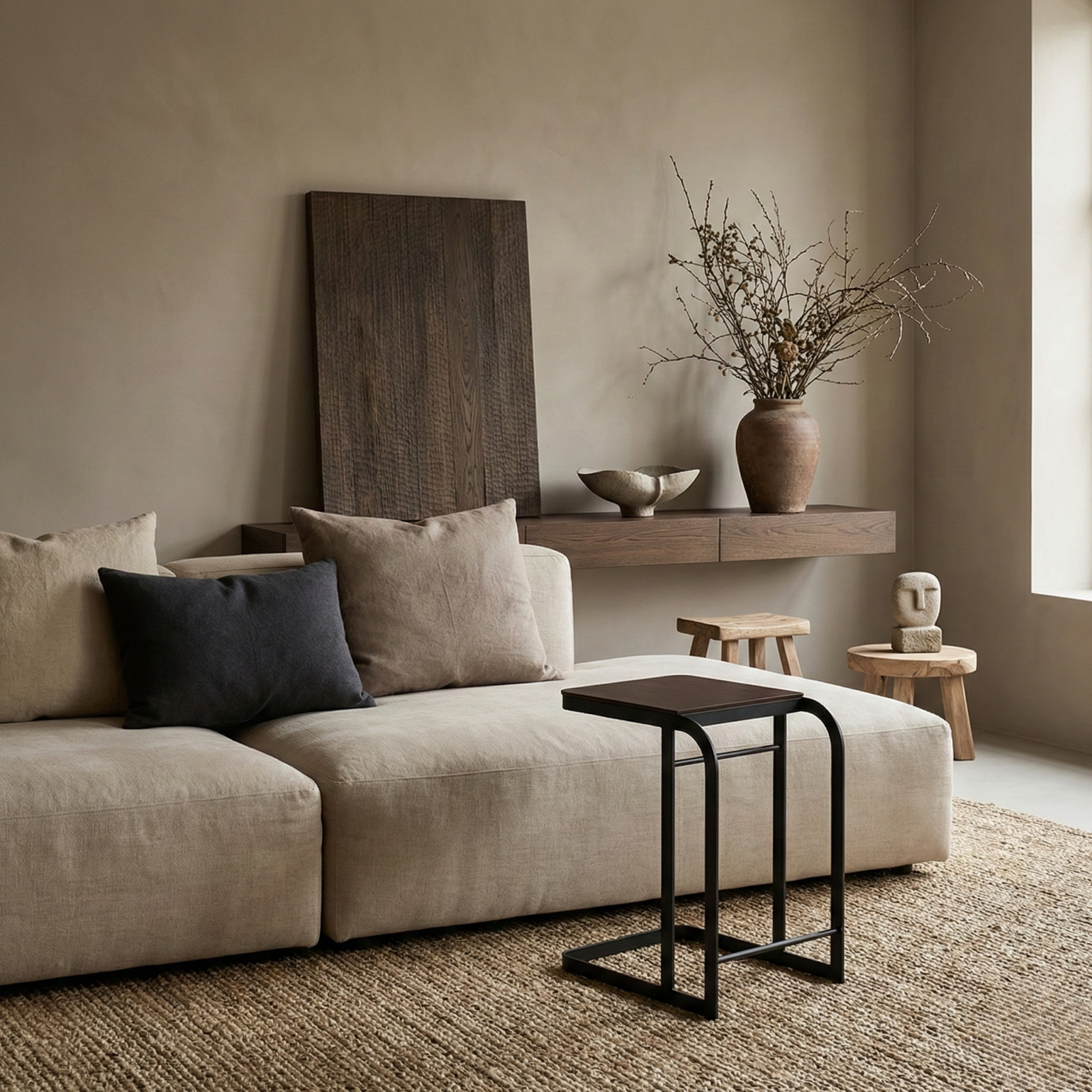 The tabletop is finished in dark wood tones, bringing warmth and depth to the minimal structure. Designed for daily placement of books, a cup, or a small lamp, it offers a calm, composed surface without visual clutter.