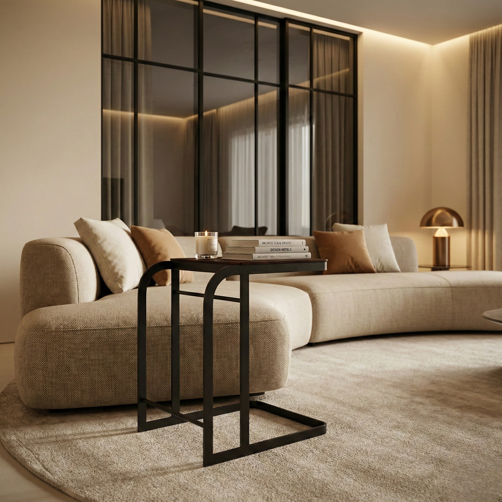Foxlite Side Table pairs a quiet architectural frame with a refined wood surface, creating a side table that feels light in the room yet purposeful in use. The continuous metal profile forms a clean, rounded outline, while the open base allows the table to tuck in close to sofas, lounge chairs, or bedsides.