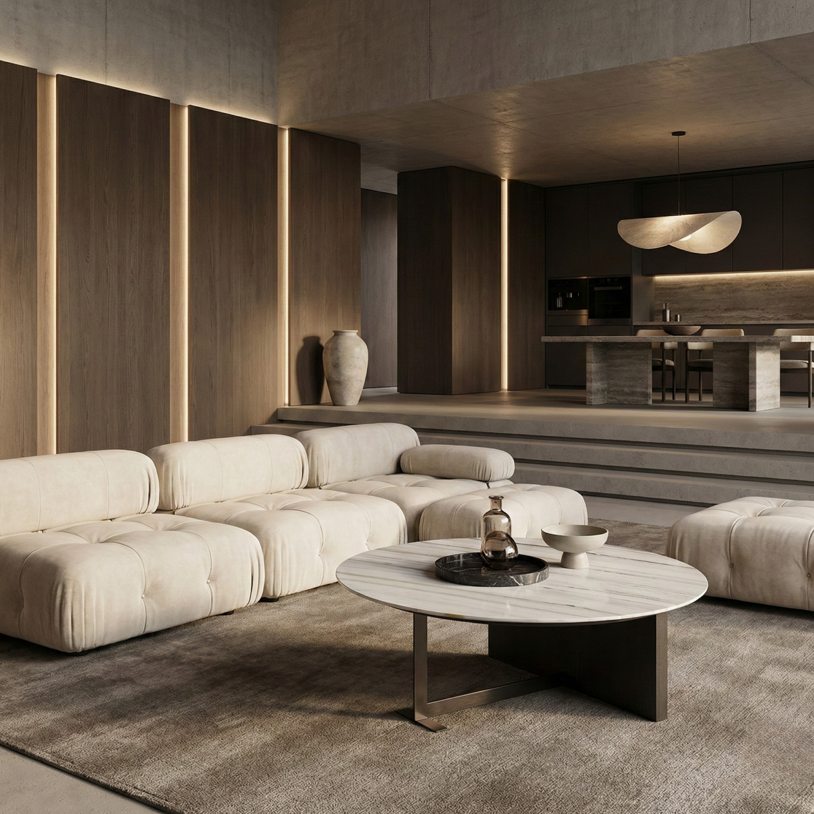 Designed for modern living rooms and hospitality lounges, Grueso sits comfortably alongside modular seating and low-profile sofas, anchoring the space without visual noise.