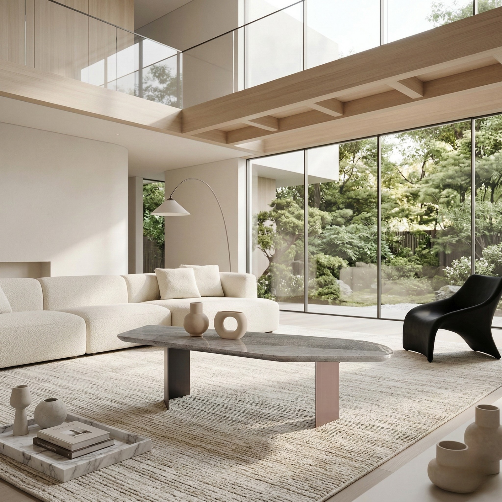 Gusion Coffee Table – 0.6 is defined by a long, softened marble plane that brings quiet weight to the room. The Italian grey natural marble top offers a refined surface presence, with subtle tonal movement that reads calm and architectural.