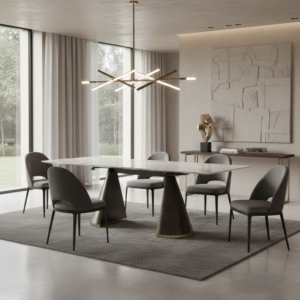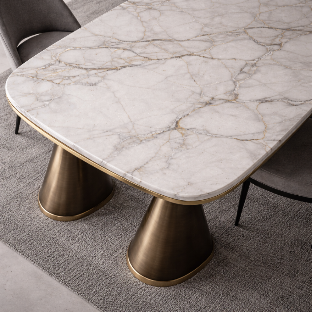 Banyak meja makan berukuran besar gagal menciptakan kesan seimbang. Sebagian tampak terlalu berat secara visual, sebagian lain tidak cukup stabil untuk penggunaan jangka panjang. Di sisi lain, meja dengan material mewah sering kali mengorbankan fungsi ergonomis dan ketahanan struktural. Half Cone Dining Table 3.0 dirancang untuk mengatasi dilema tersebut dengan pendekatan desain arsitektural yang presisi, memadukan kekuatan struktur logam dengan keanggunan marmer alami, sehingga menghadirkan solusi sempurna bagi ruang makan modern yang menuntut estetika dan performa sekaligus.